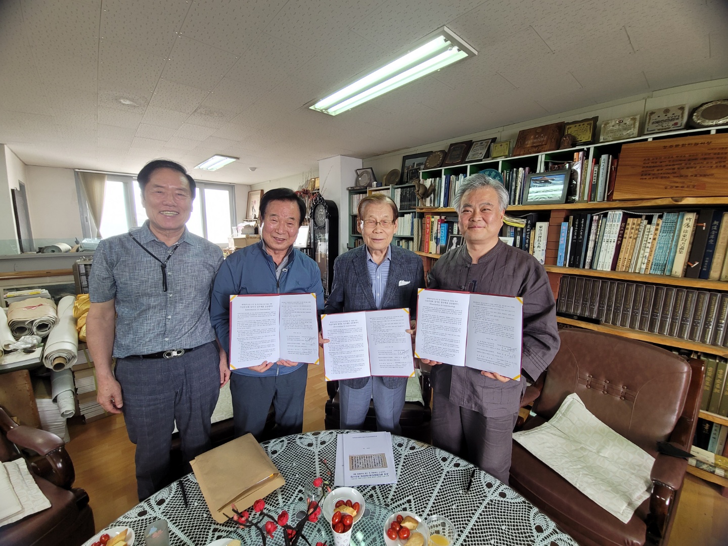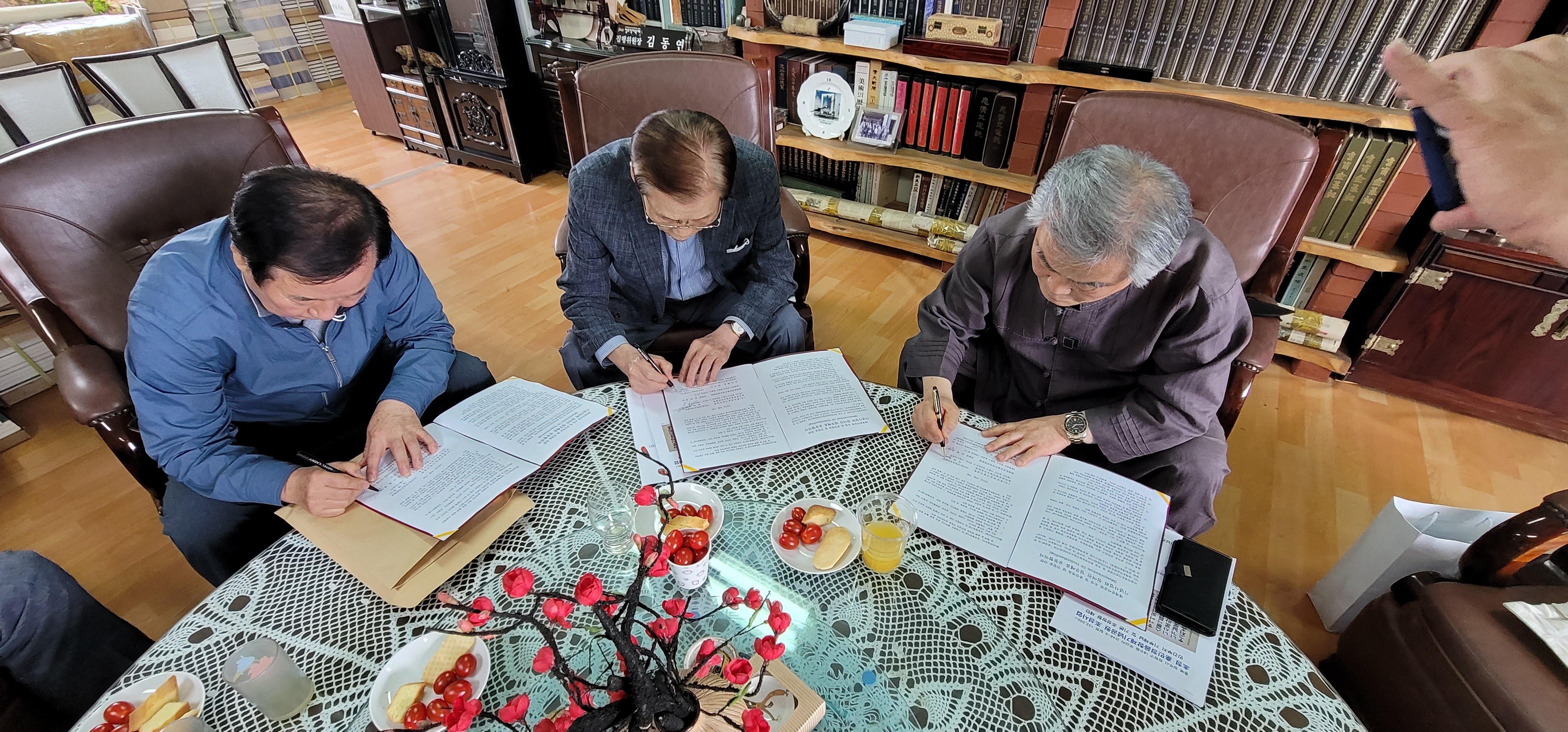 ‘훈정회’ 박재성 이사장과 ‘공추위’ 신방웅 위원장, 부지 ‘희사자’ 나기정 전 청주시장 간에 체결된 협약식은 이동주 기획처장이 작성해온 협약서(안)를 검토한 후 이견 사항에 대해서 충분한 협의를 거쳐 최종적으로 협약서에 서명함으로써 역사적인 훈민정음 탑 건립의 첫걸음을 내딛게 되었다.