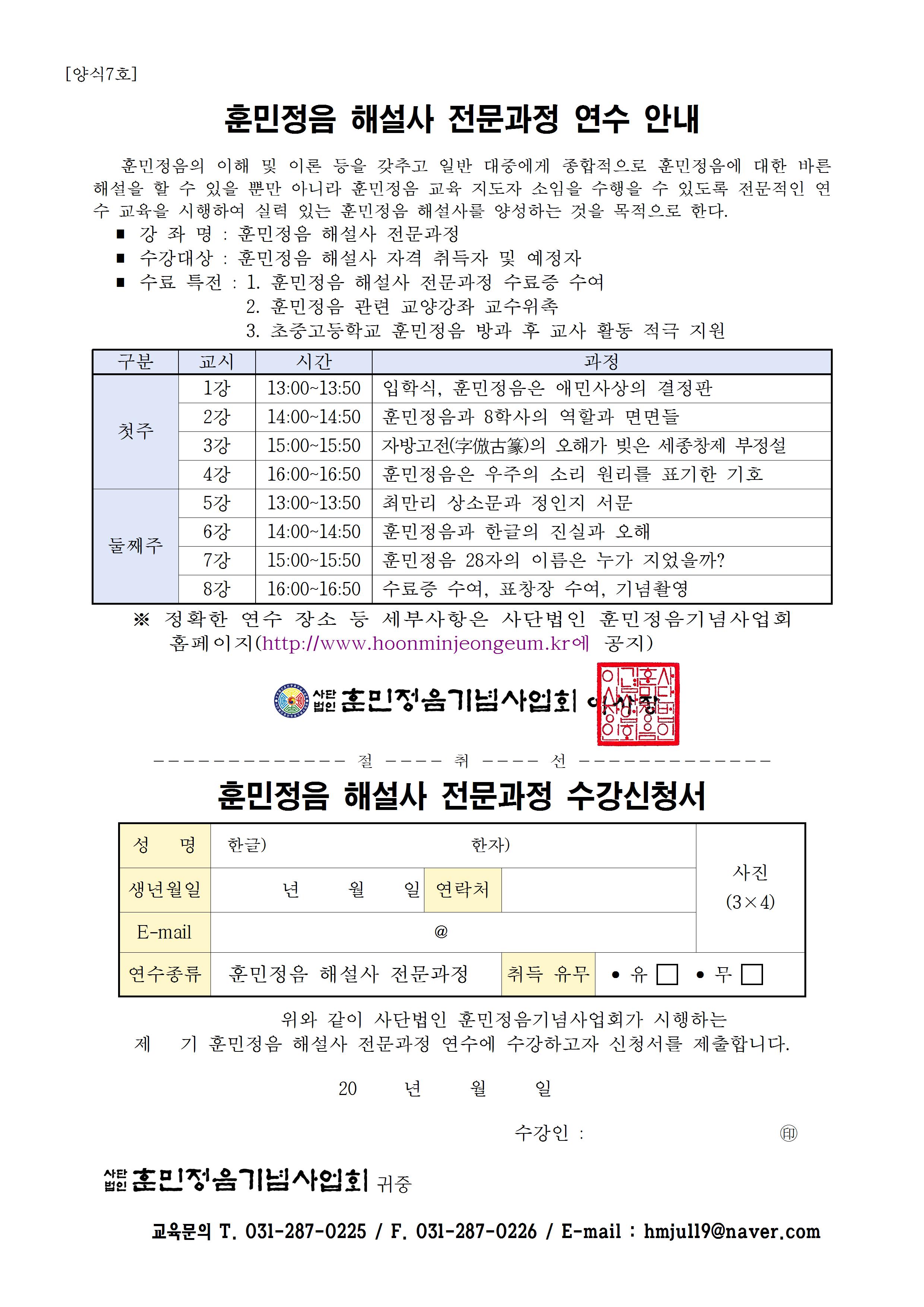 [양식7호] 훈민정음해설사 전문과정 수강 신청서