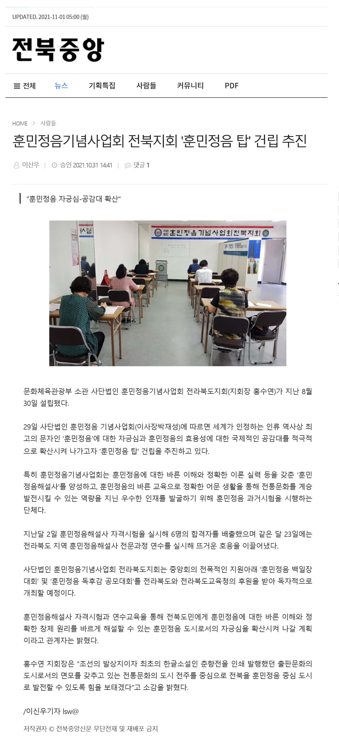 훈정회 전북지회 설립 보도