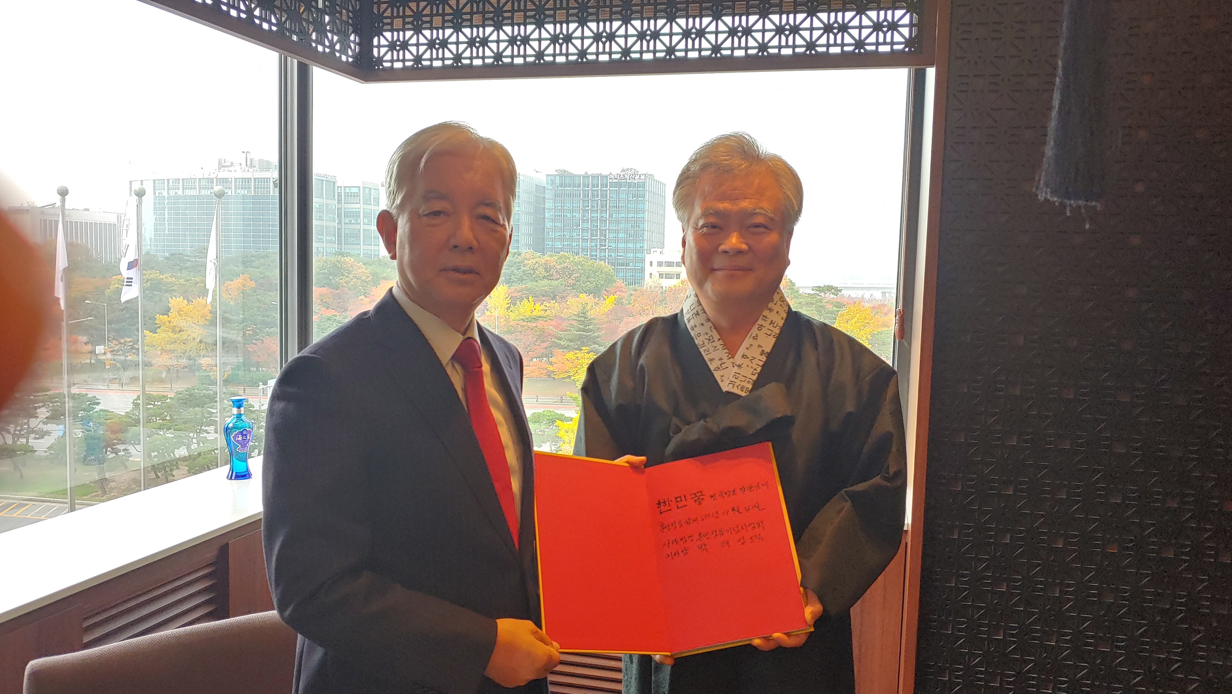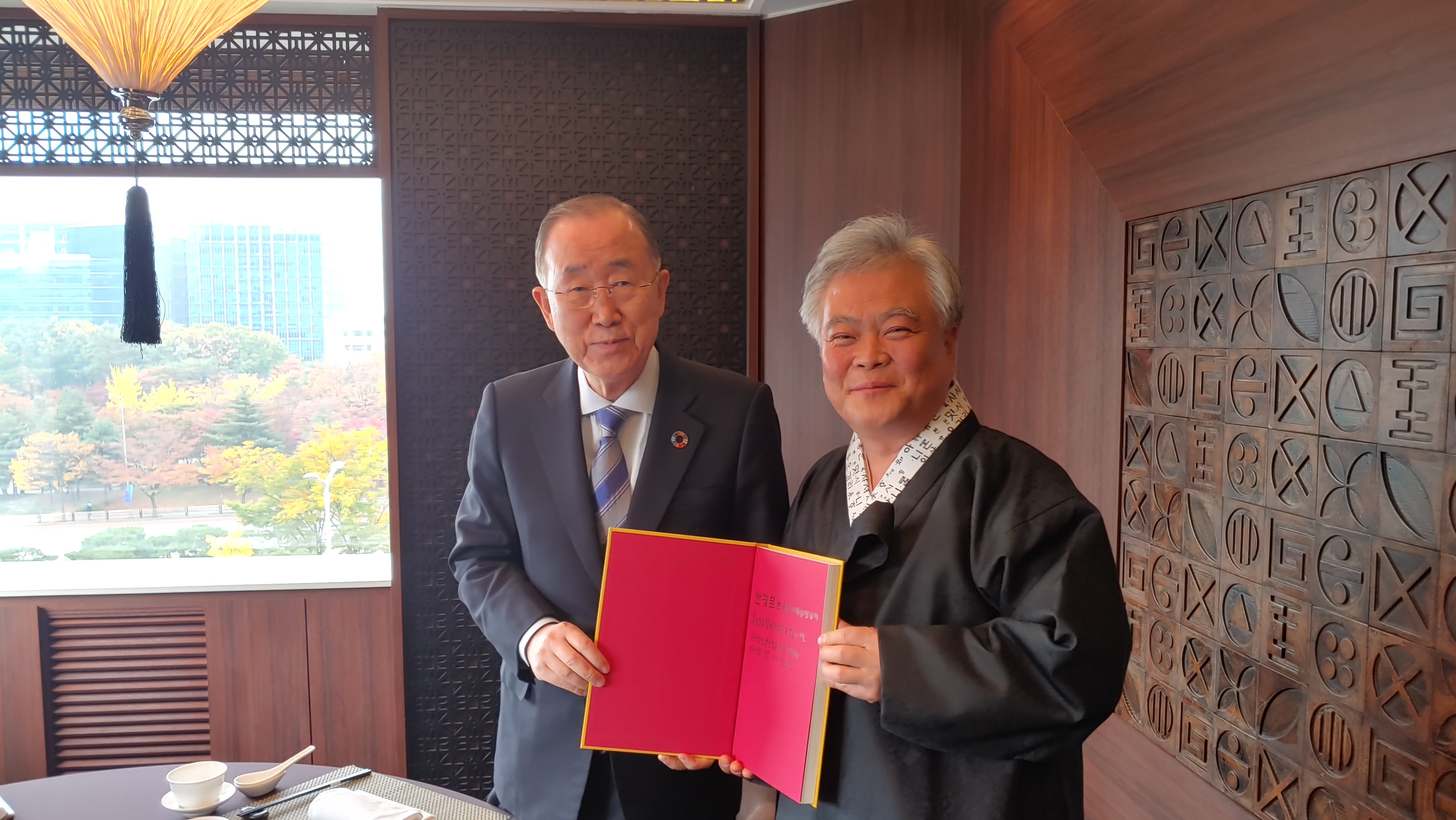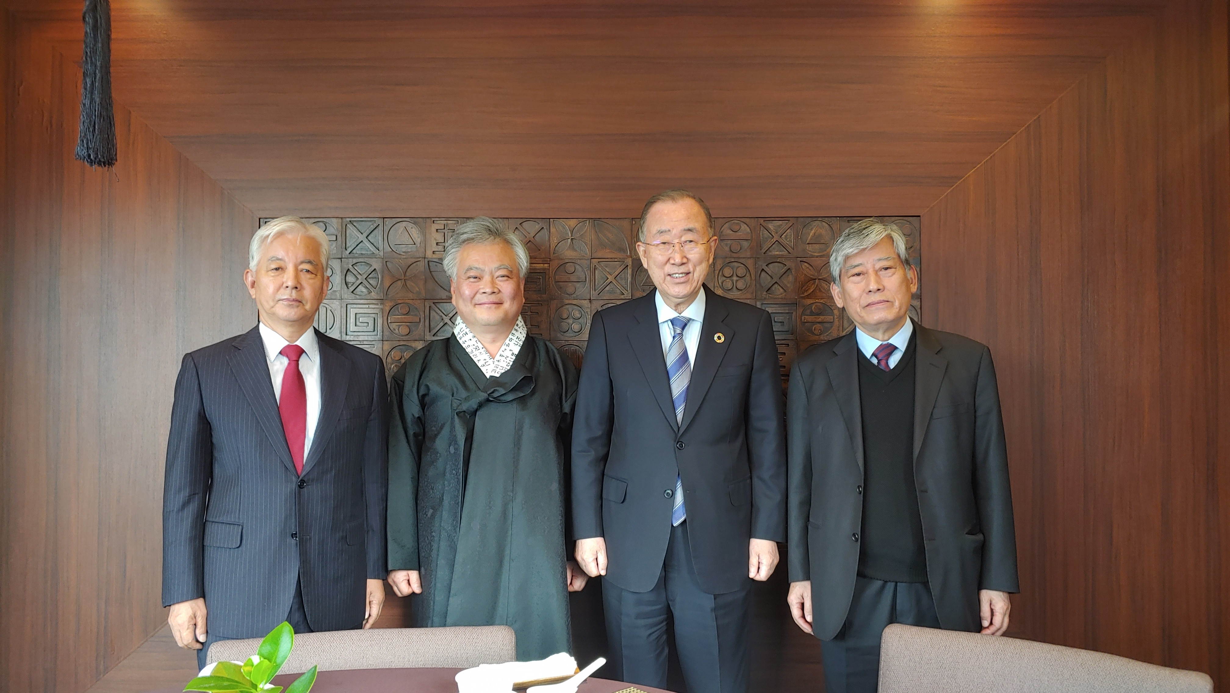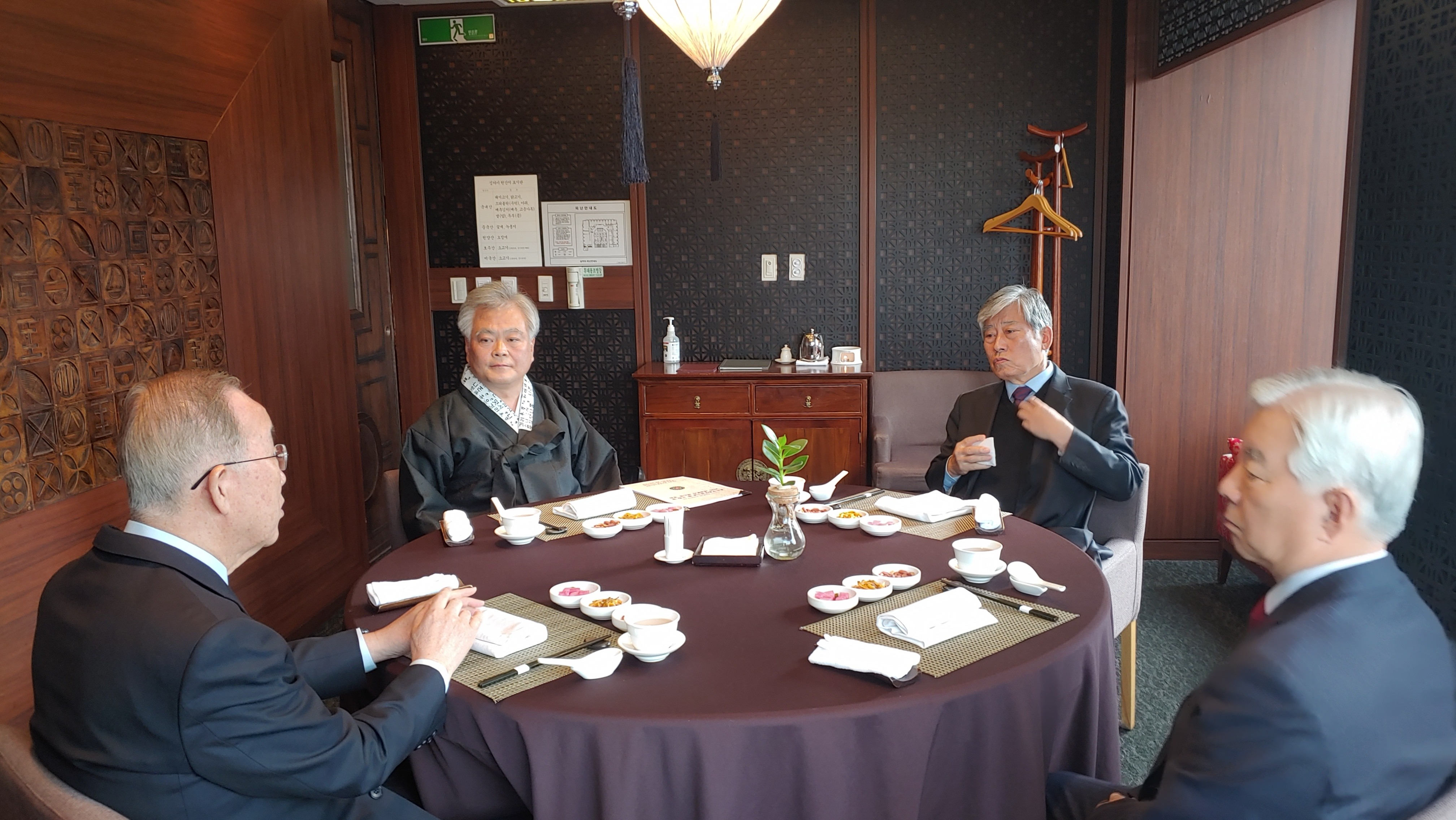 2021년 11월 4일(목) 12시부터 약 2시간 가량 싱카이 여의도점에서 제8대 유엔사무총장을 역임한 반기문 보다나은미래를위한 반기문재단 이사장은 훈민정음탑건립조직위원회(이하 ‘훈탑위’) 발족 1주년을 기념하여 훈탑위 명예조직위원장으로서 사단법인 훈민정음기념사업회 박재성 이사장과 한민구 전 국방장관, 박근영 전 고려대 총교우회장을 초청하여 오찬을 겸한 환담을 하였다.<김은정 언론홍보처장>