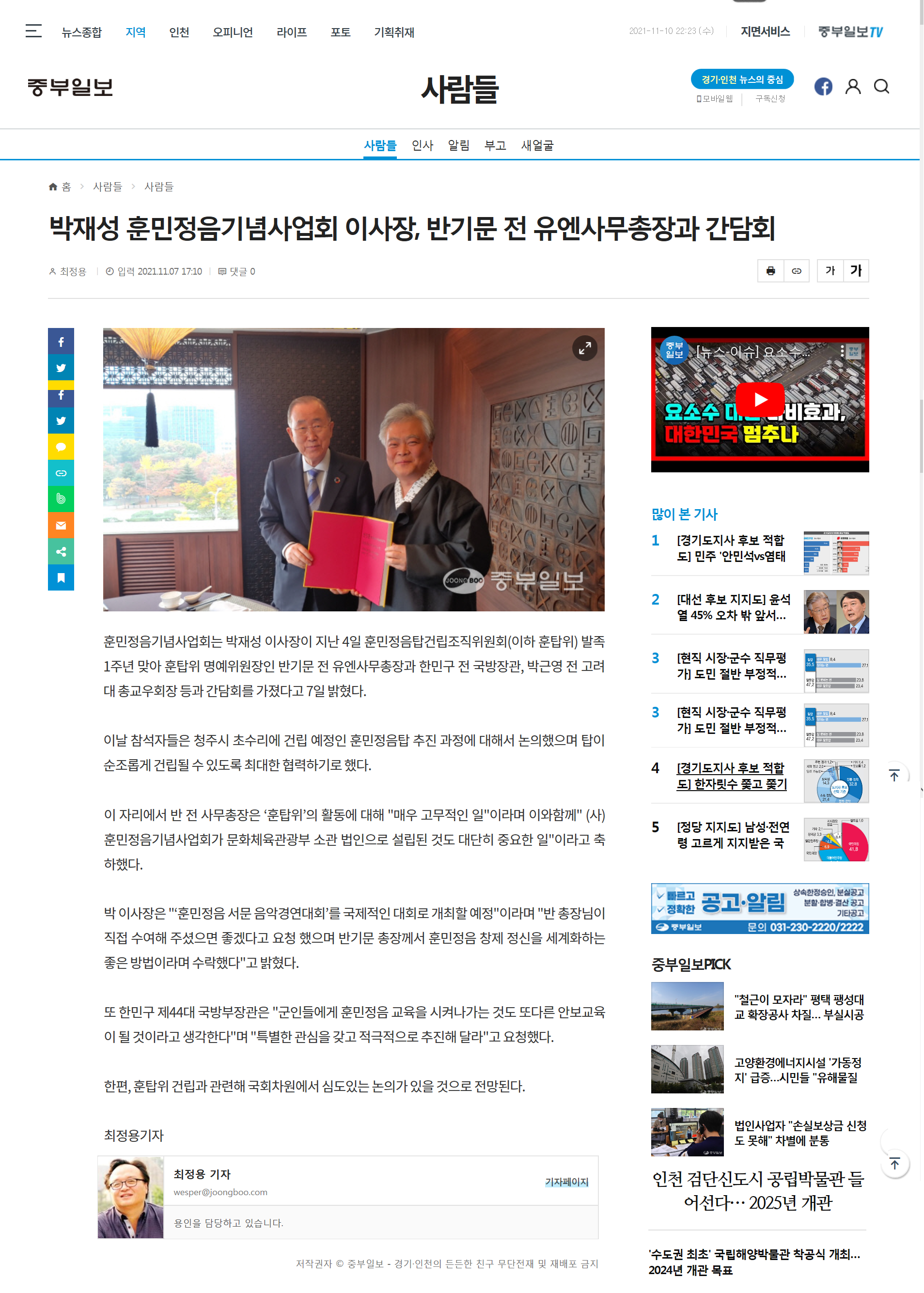 [중부일보] 박재성 훈민정음기념사업회 이사장 반기문 전 유엔사무총장과 간담회