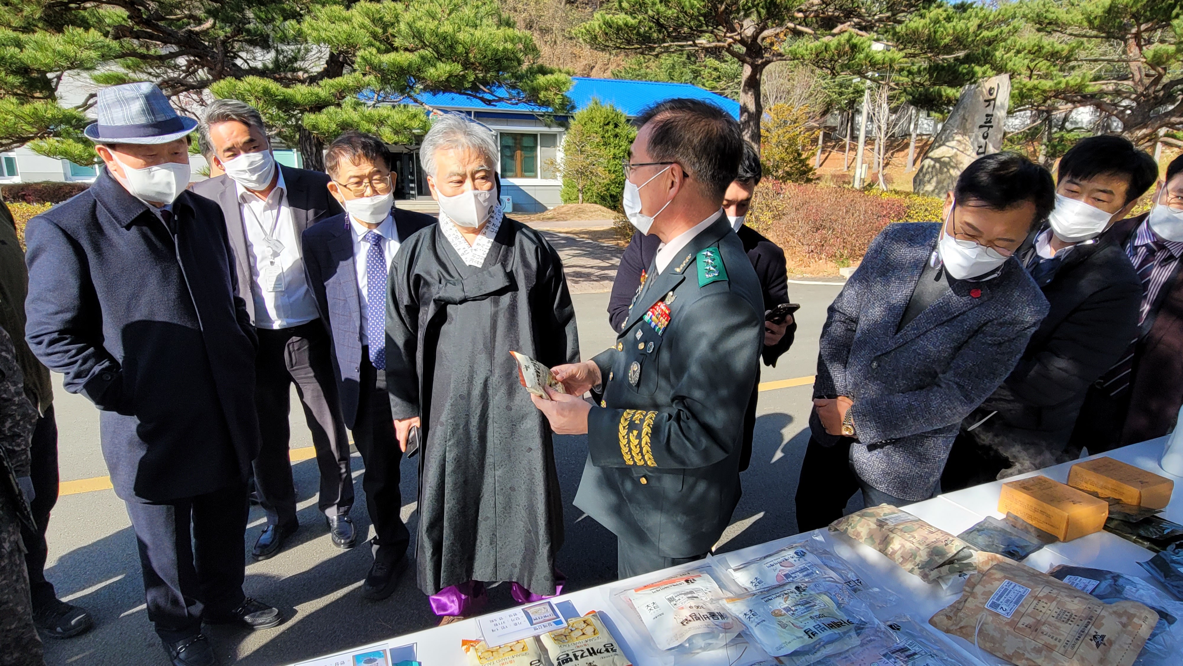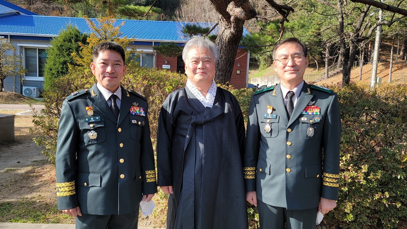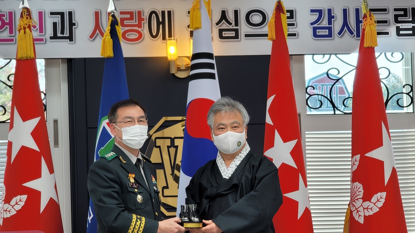 2021년 11월 25일(목) 오전 11시 30분 육군 제8군단장 강창구 중장 초청을 받고 8군단을 방문한 사단법인 훈민정음기념사업회 박재성 이사장은 병사들의 피복 및 전투식량 등에 대해서 강창구 군단장으로부터 설명을 들었다.