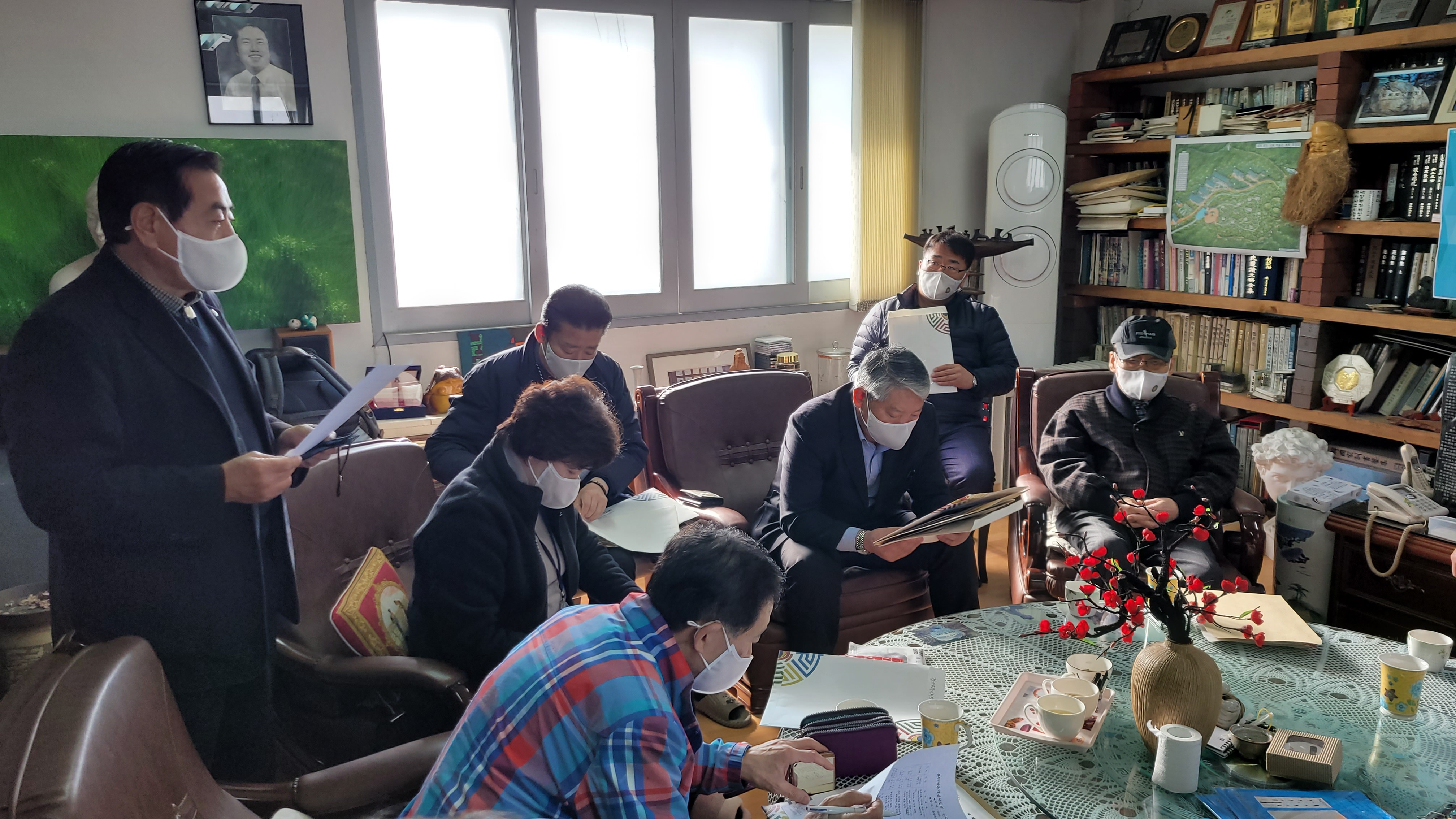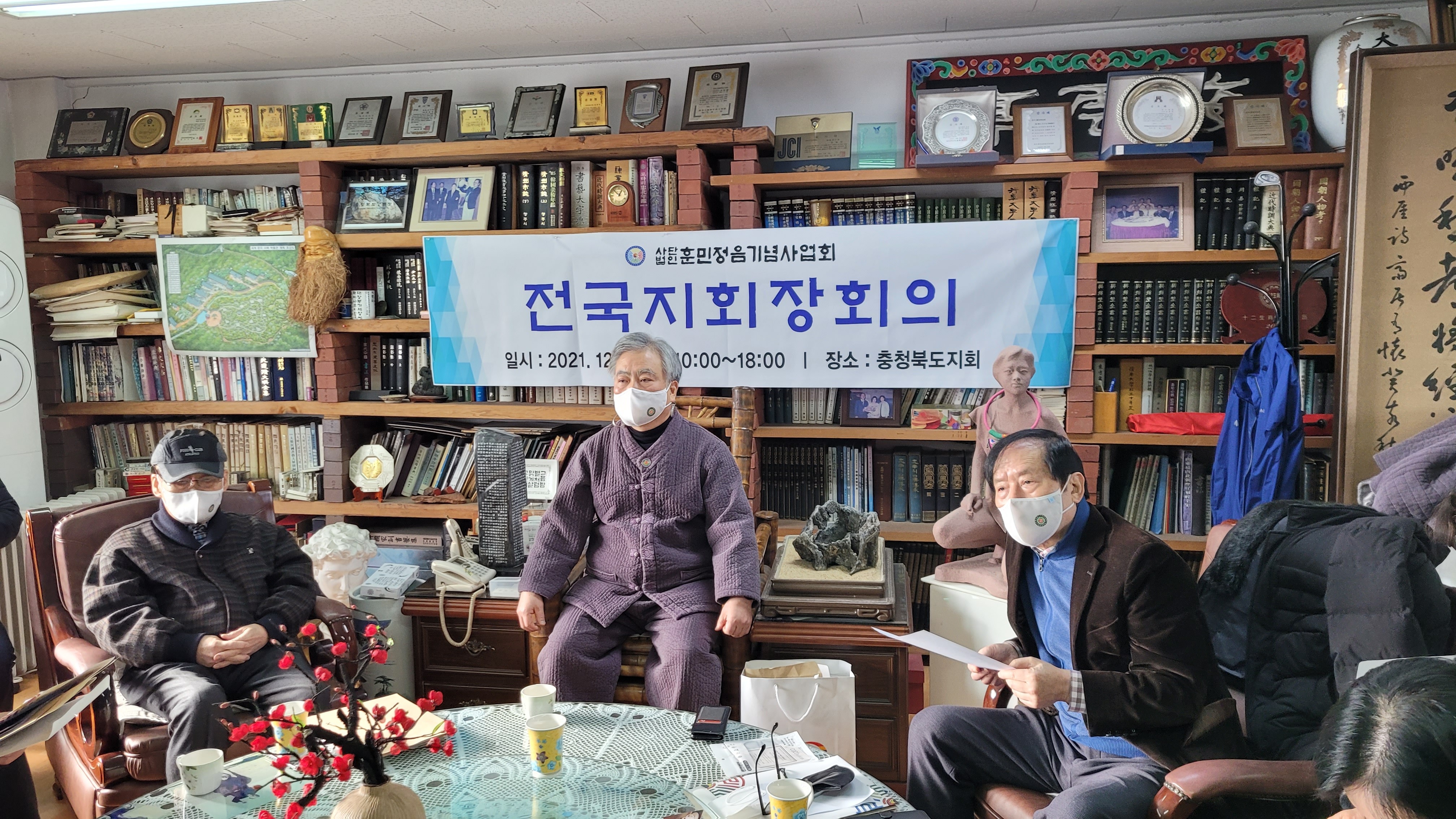 2021년 12월 9일(목) 오전10시부터 오후 6시까지 사단법인 훈민정음기념사업회 전국지회장 회의가 충북지회(지회장 김동연) 주관으로 진행되었다. 이동주 기획처장의 사회로 진행된 이날 전국지회장 회의에서 박재성 이사장은 인사말을 통해 올해 20212년을 뒤돌아볼 때 참으로 열심히 노력한 결과 장족의 발전을 해왔다고 자평하고 싶다고 간단히 소감을 피력한 뒤 참석자들을 일일이 소개하고 경기남부지회장이 증정한 방역마스크를 나눠주었다. 이날 전국 지회장 회의에 첨석자는 다음과 같다.