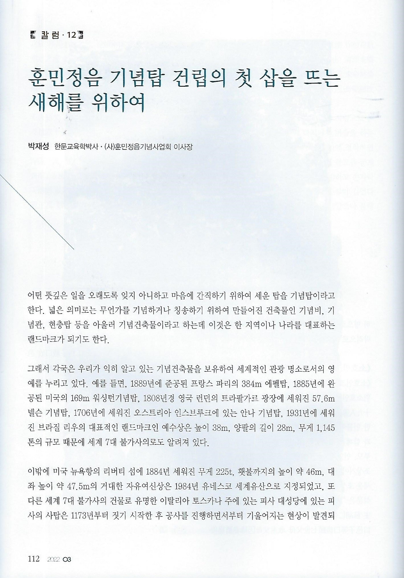 [칼럼12] 훈민정음 기념탑 건립의 첫 삽을 뜨는 새해를 위하여