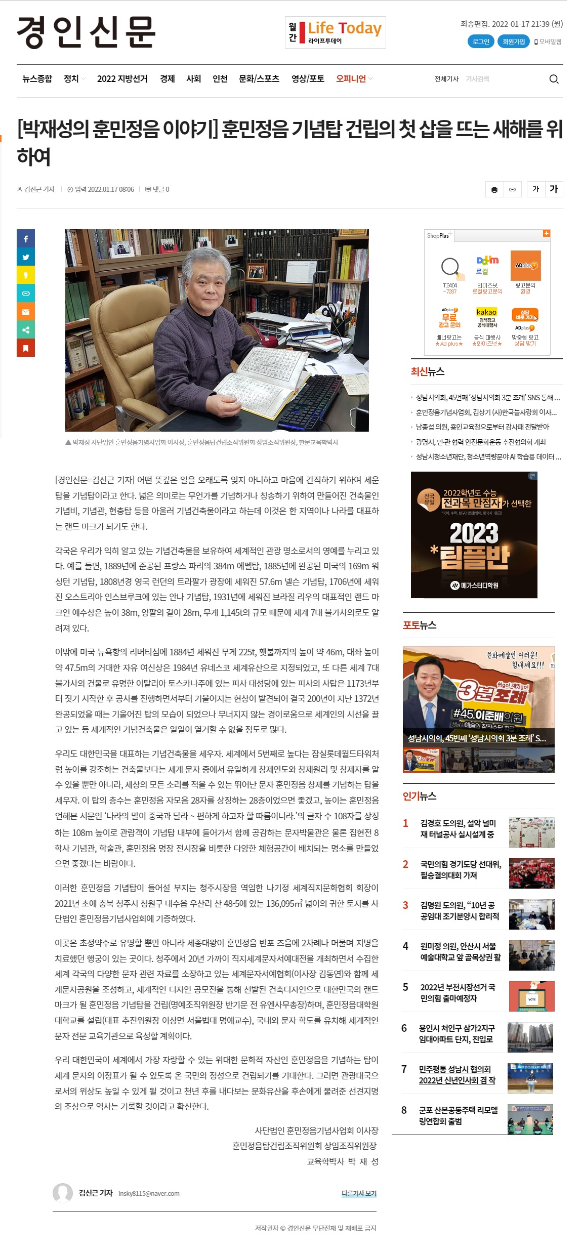 [박재성의 훈민정음 이야기] 훈민정음 기념탑 건립의 첫 삽을 뜨는 새해를 위하여 < 오피니언 < 기사본문 - 경인신문 (asn24.com)