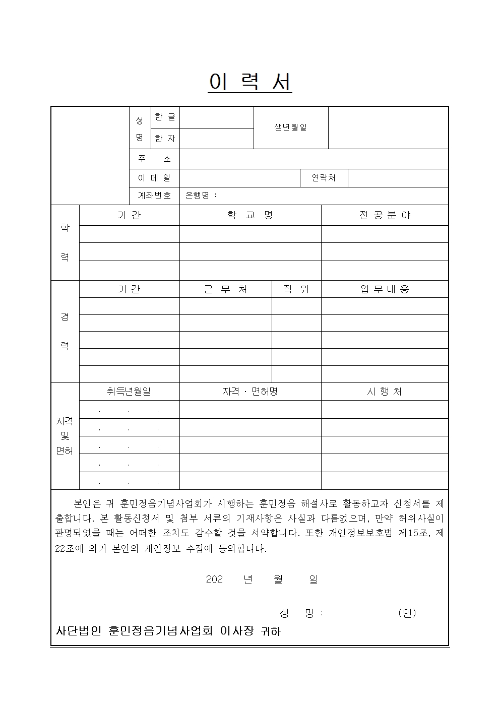 [양식11호] 훈민정음 경필쓰기 검정 응시원서
