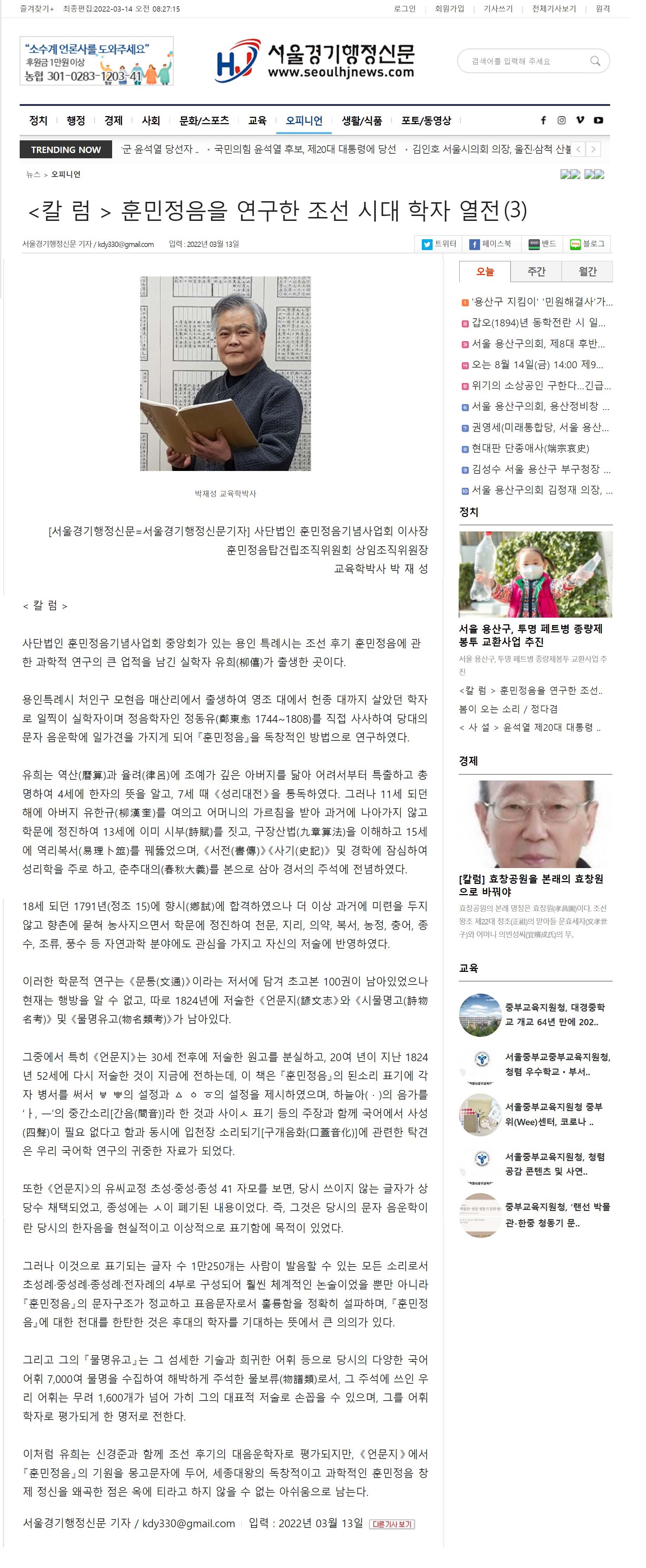[서울경기행정신문] 훈민정음을 연구한 조선시대 학자 열전(3)