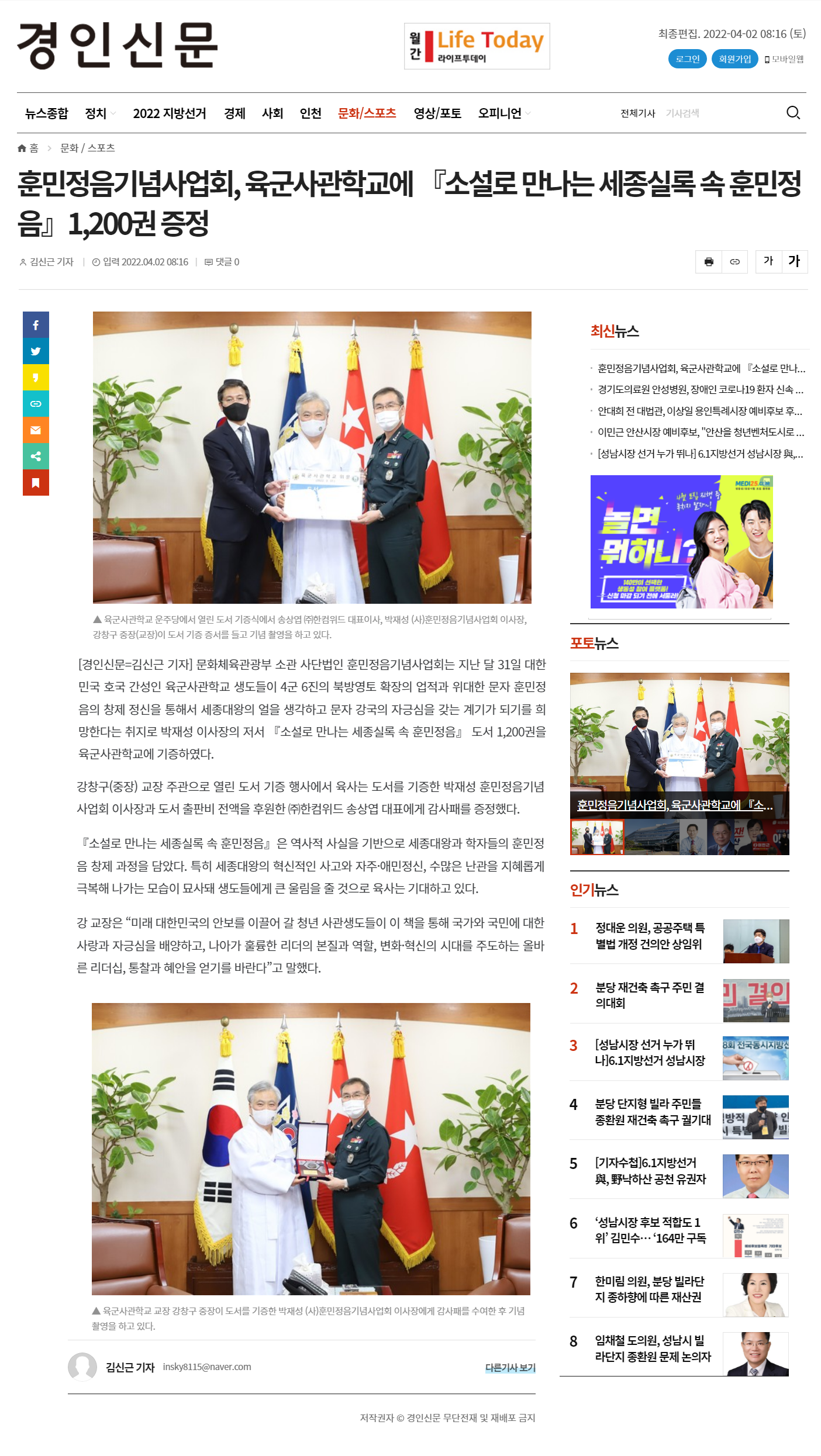 훈민정음기념사업회, 육군사관학교에 『소설로 만나는 세종실록 속 훈민정음』1,200권 증정 < 문화 / 스포츠 < 기사본문 - 경인신문 (asn24.com)