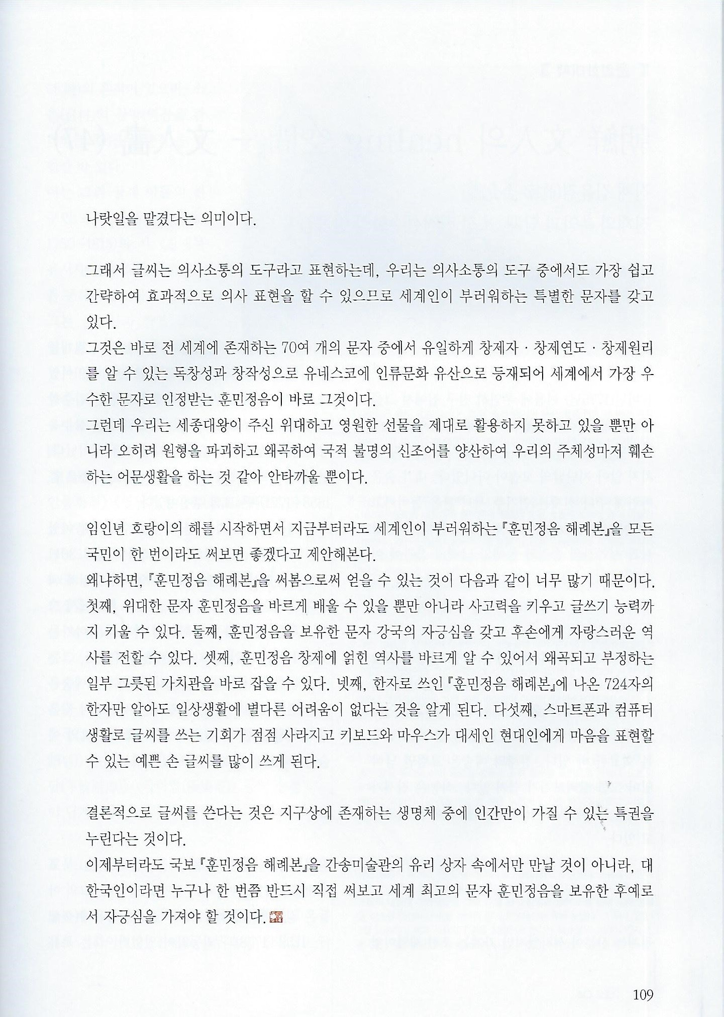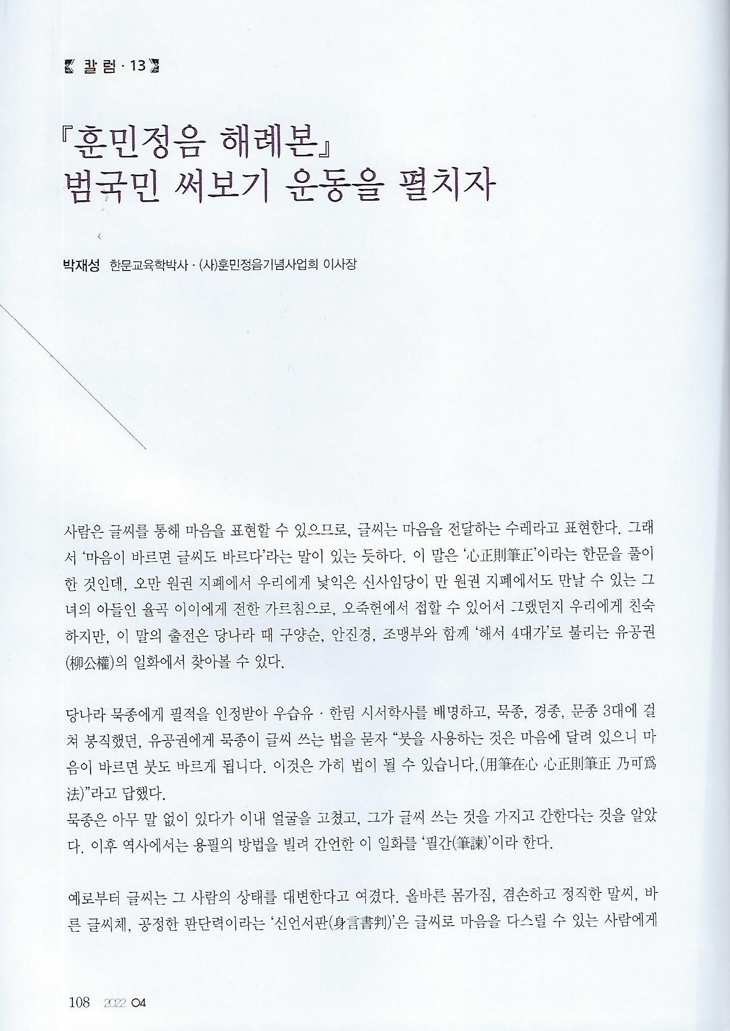 [월간서예문인화] 훈민정음 해례본 범국민 써보기 운동을 펼치자