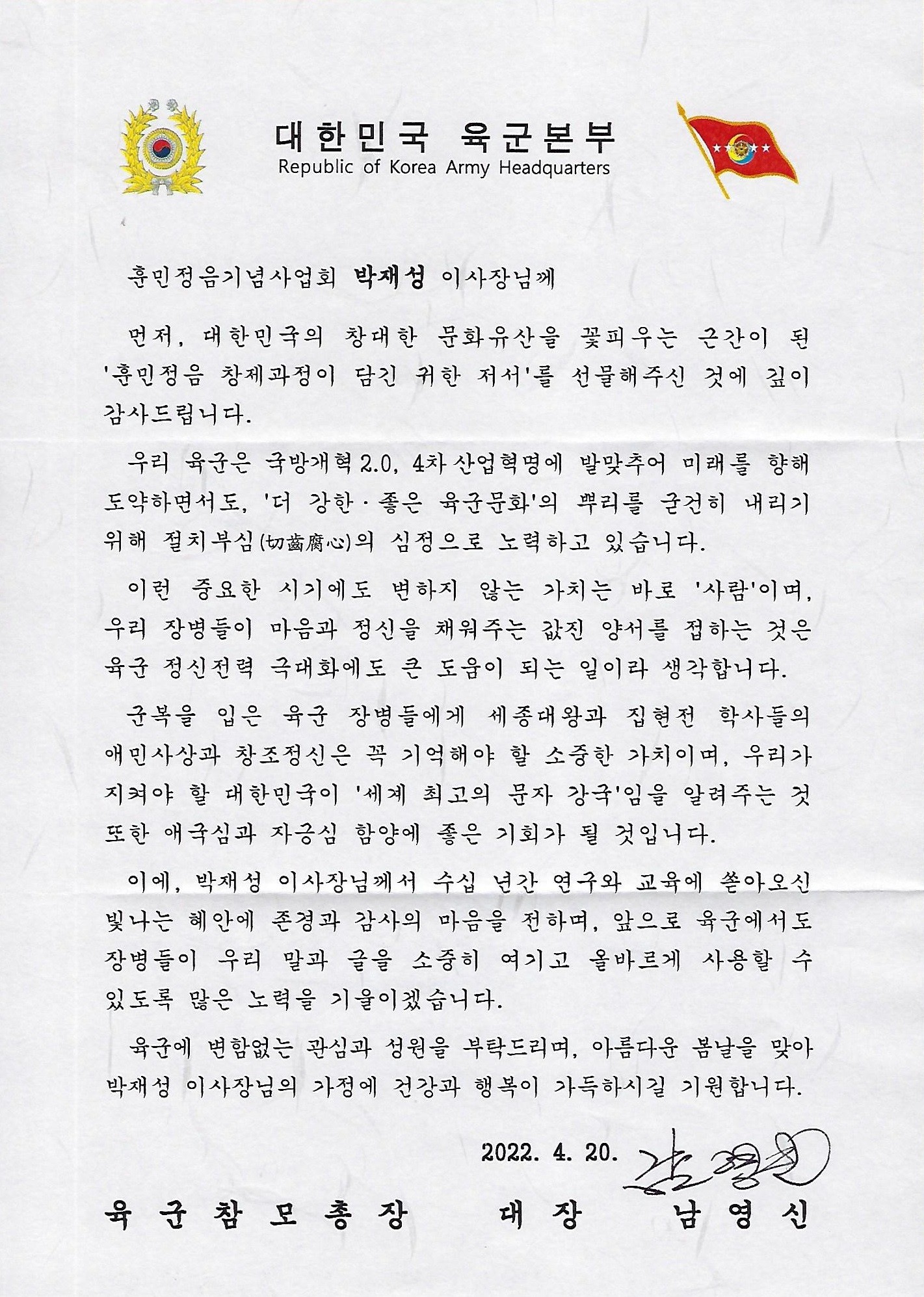 육군참모총장 남영신 대장 친필 감사 서한 수취