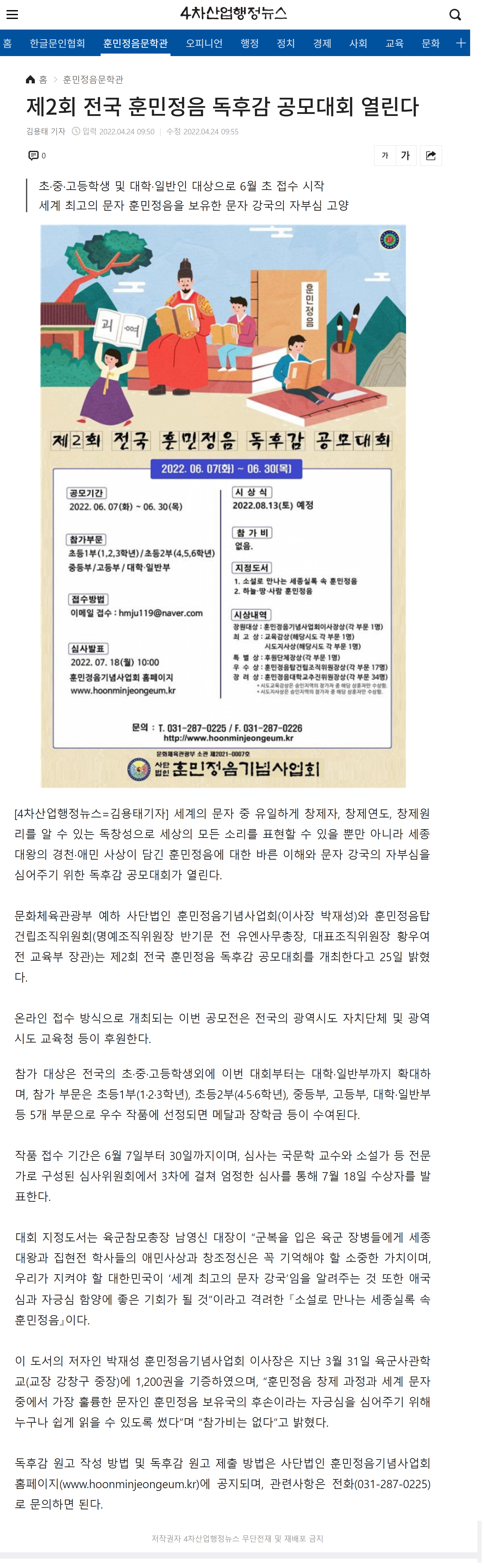 [4차산업행정뉴스] 제2회 전국 훈민정음 독후감 공모대회 열린다