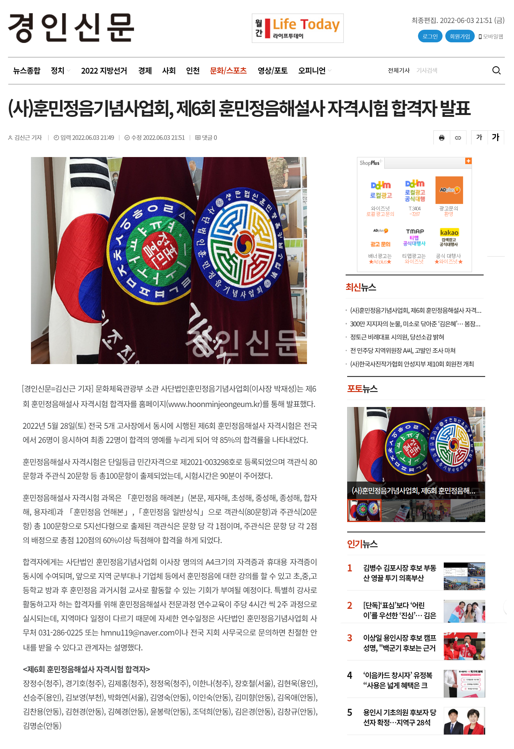 [경인신문] 제6회 훈민정음해설사 자격시험 합격자 발표