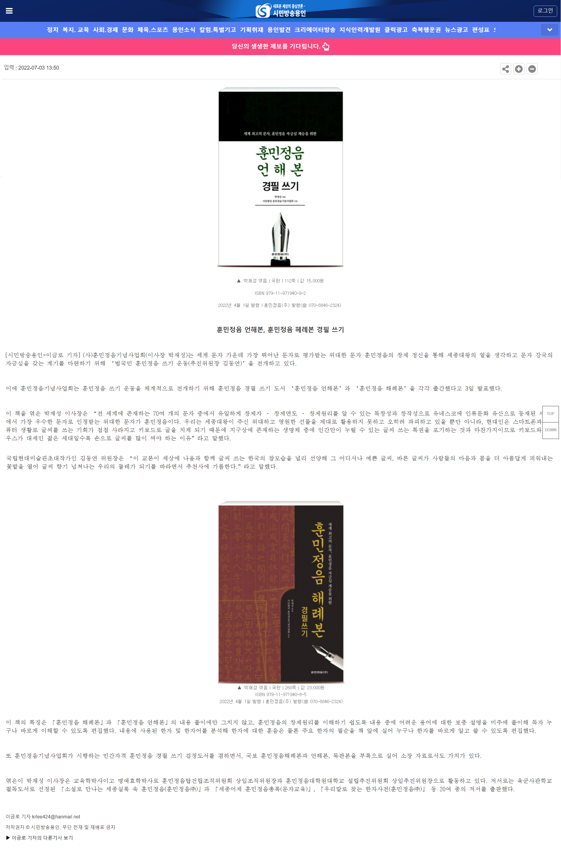 [시민방송용인] 훈민정음 경필쓰기 도서 출간