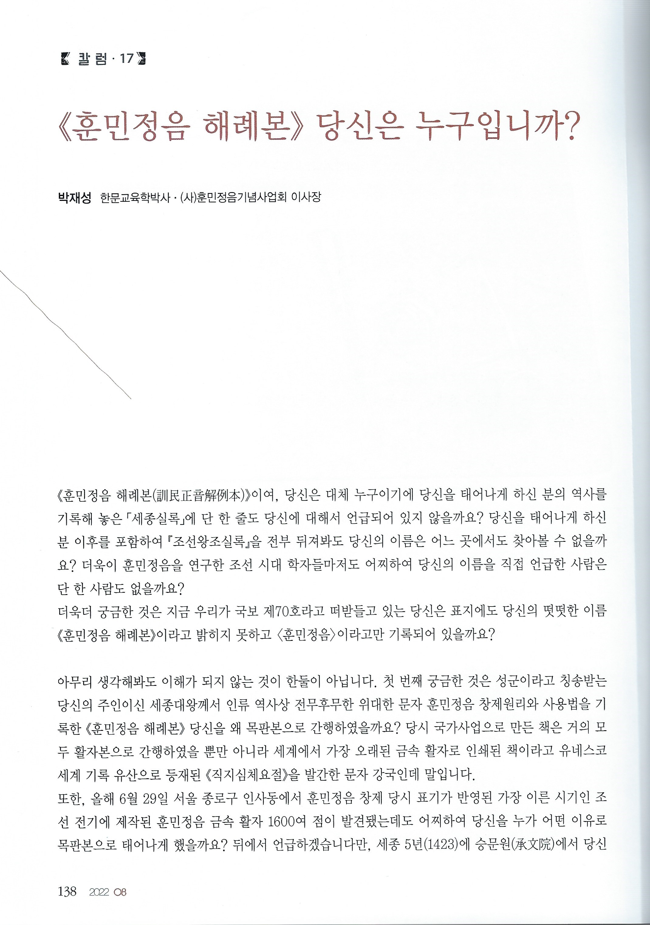 [월간서예문인화] <훈민정음 해례본> 당신은 누구입니까?