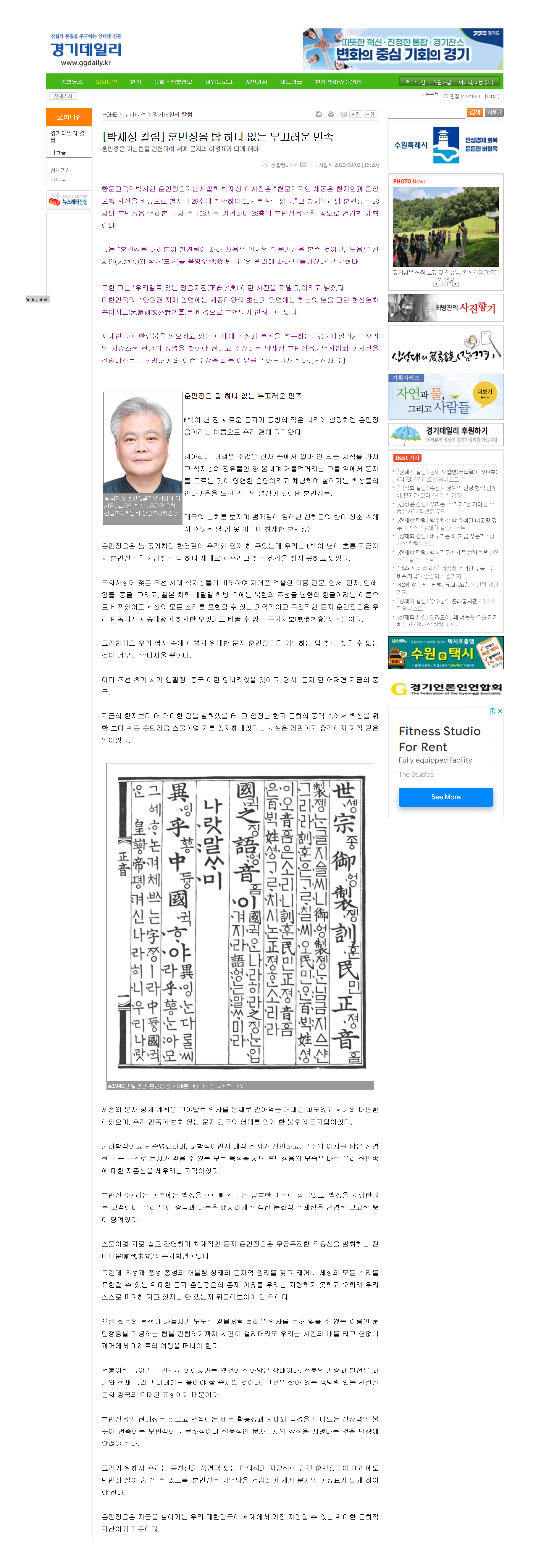 [경기데일리] 훈민정음탑 하나 없는 부끄러운 민족