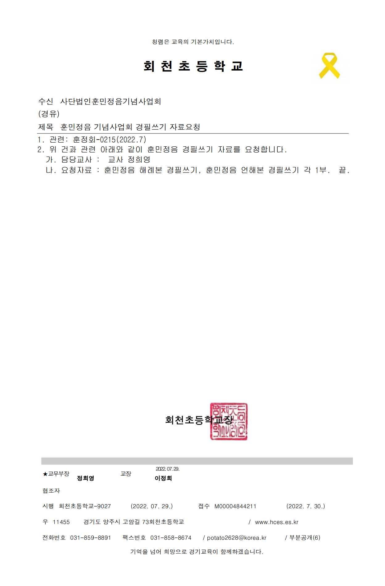 양주회천초등학교 훈민정음경필쓰기 관련자료 요청