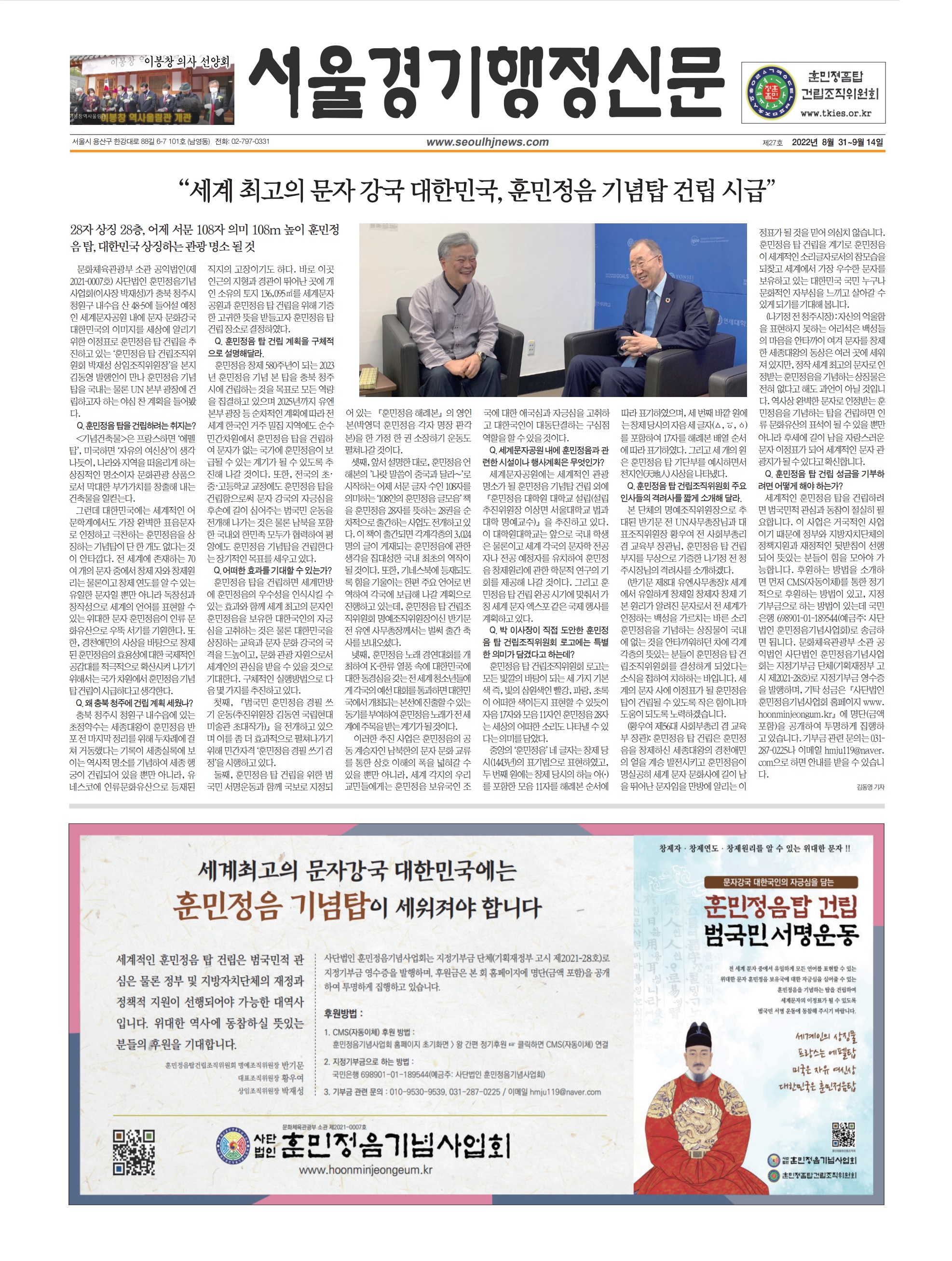 [서울경기행정신문]세계 최고의 문자 강국 대한민국, 훈민정음 기념탑 건립 시급