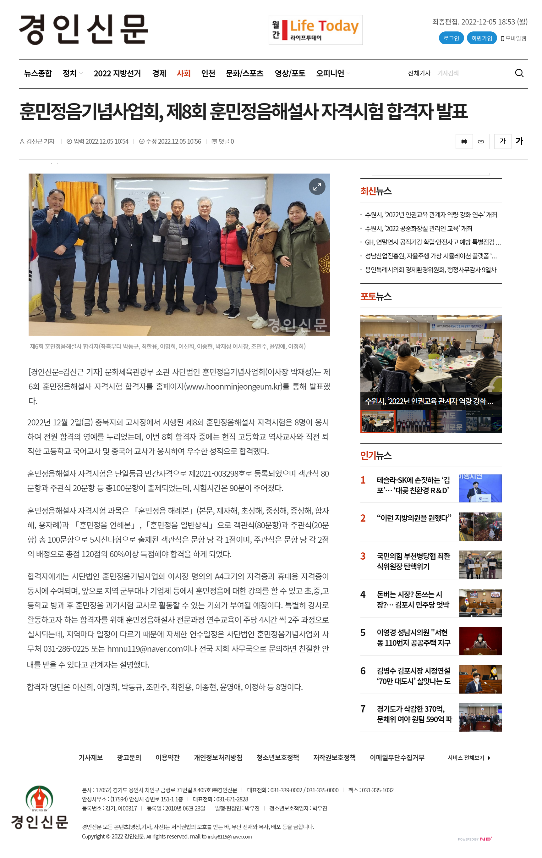 [경인신문] 제8회 훈민정음해설사 자격시험 합격자 발표