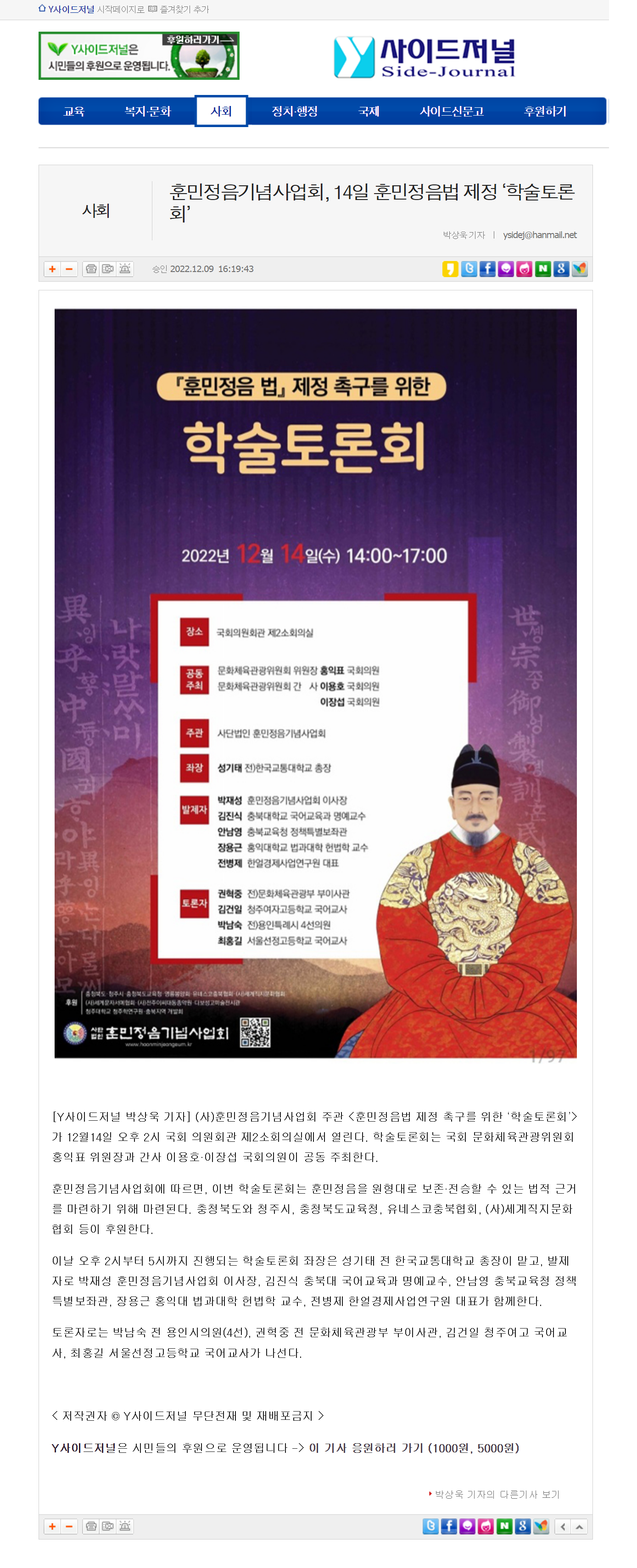 [사이드저널] 훈민정음기념사업회, 14일 훈민정음법 제정 '학술토론회'