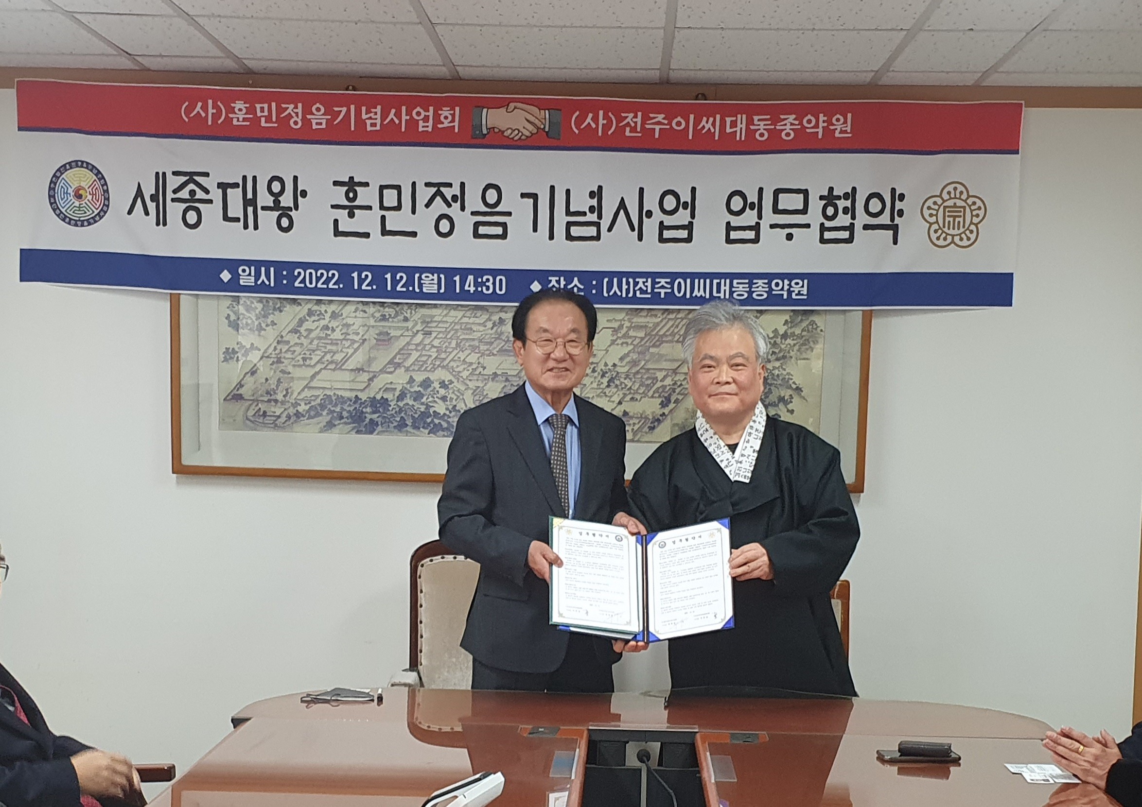 사단법인 훈민정음기념사업회(이사장 박재성. 이하 ‘훈정회’)는 지난 12일 오후 2시 30분 서울시 종로구 돈화문로 89에 위치한 이화회관 회의실에서 전주이씨대동종약원(이사장 이귀남. 이하 ‘종약원’)과 세종대왕 훈민정음기념사업을 함께 확대하기로 하고 업무협약을 체결했다.
