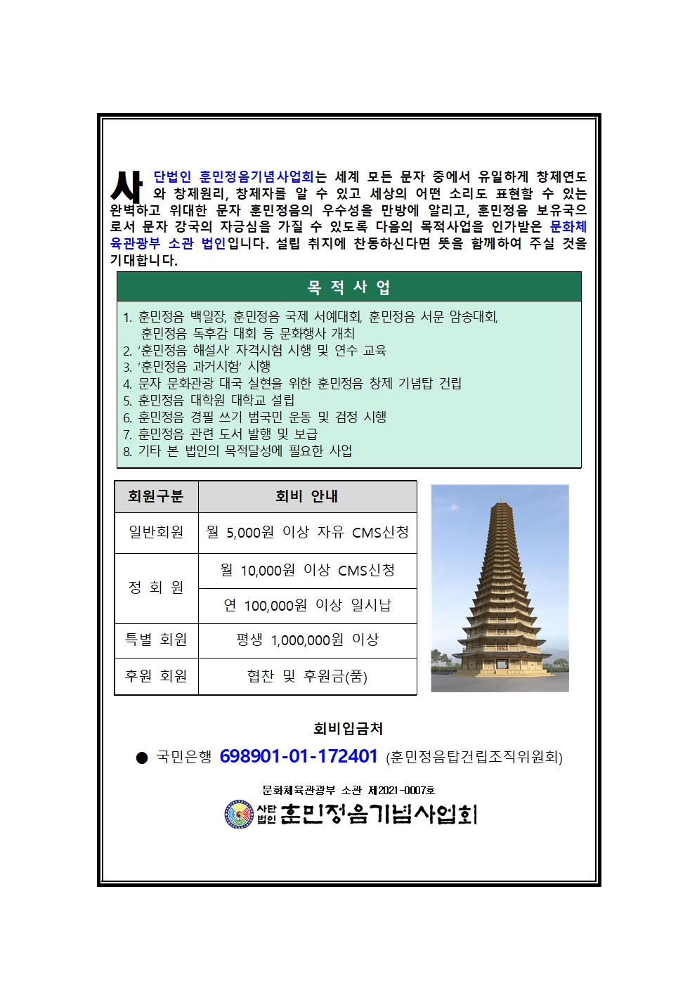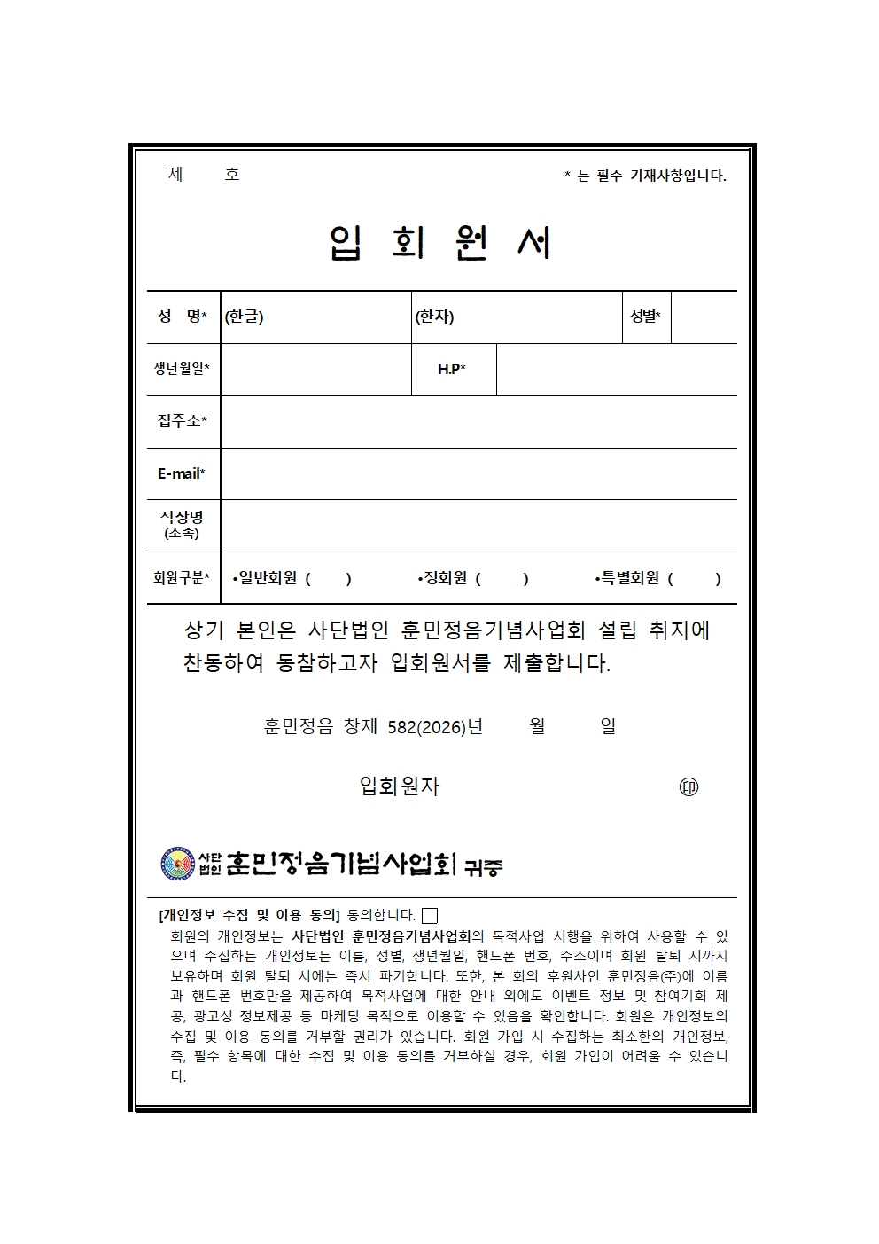 훈민정음기념사업회 입회 안내(입회원서 유)