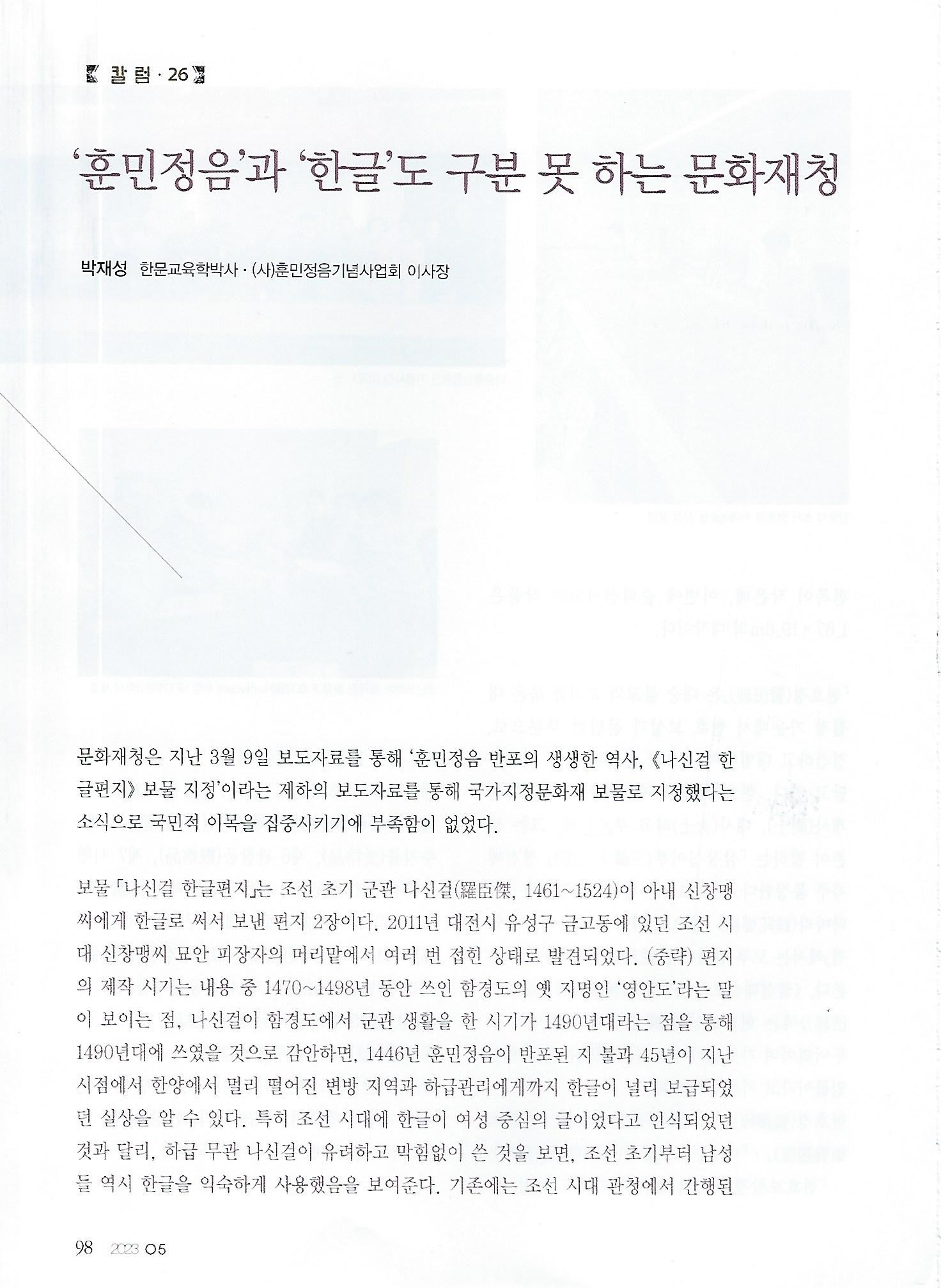 [칼럼26] '훈민정음'과 '한글'도 구분 못하는 문화재청