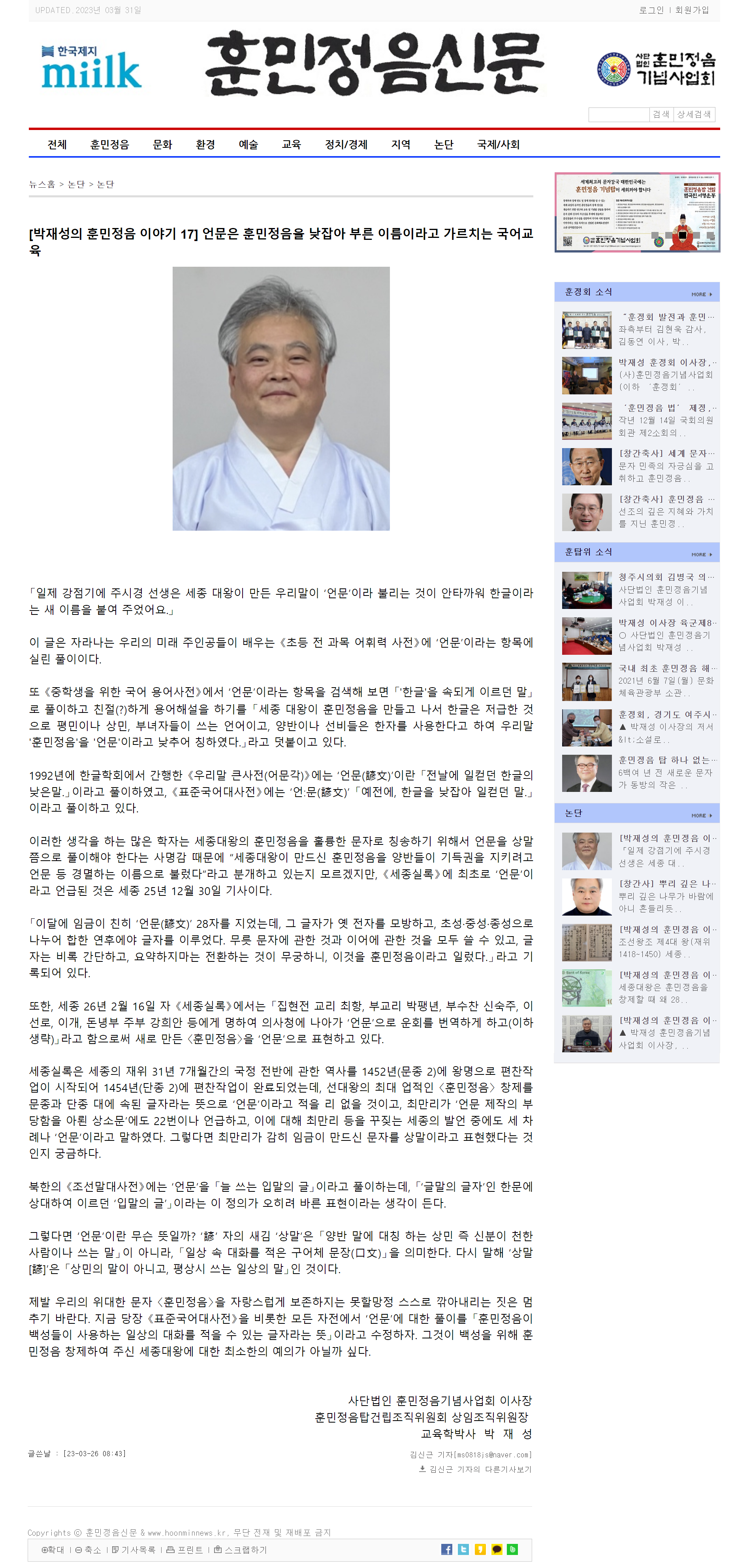 [경인신문] 언문은 훈민정음을 낮잡아 부른 이름이라고 가르치는 국어교육