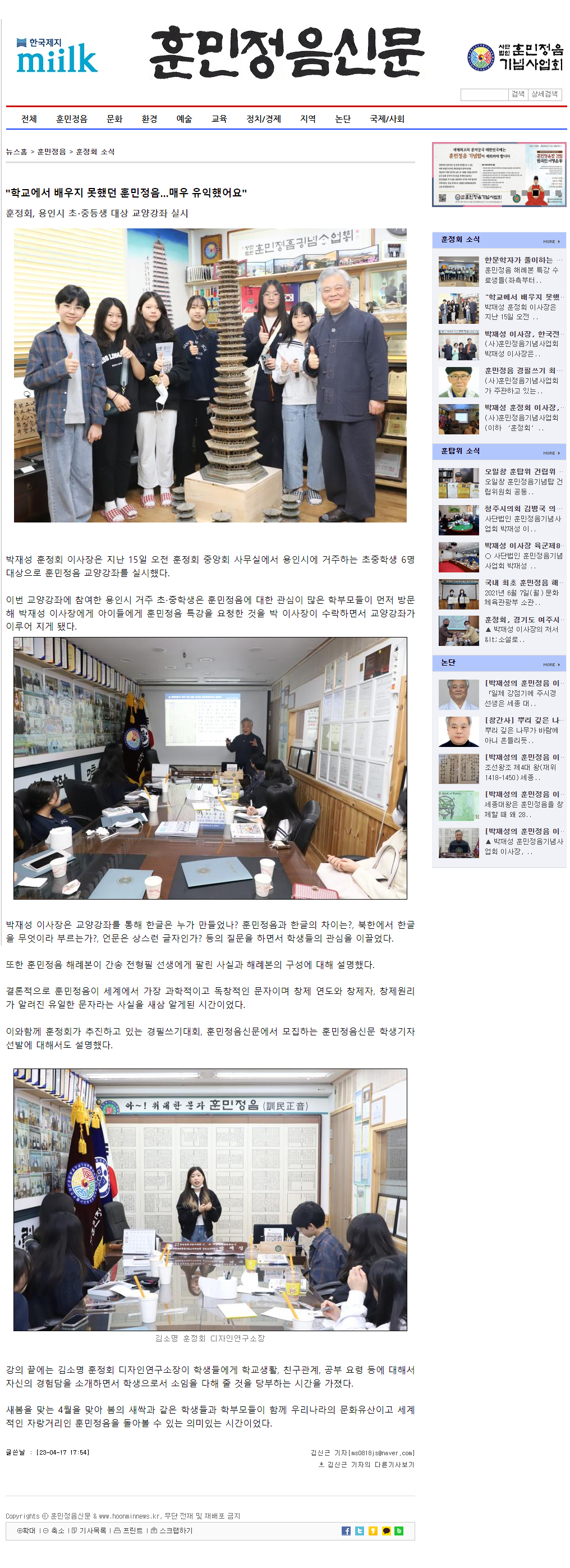 [훈민정음신문] 용인시 초중등생 대상 교양강좌 실시