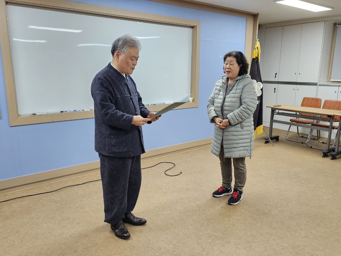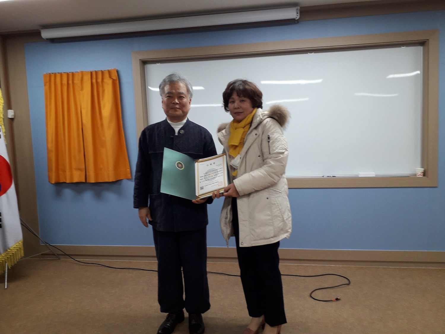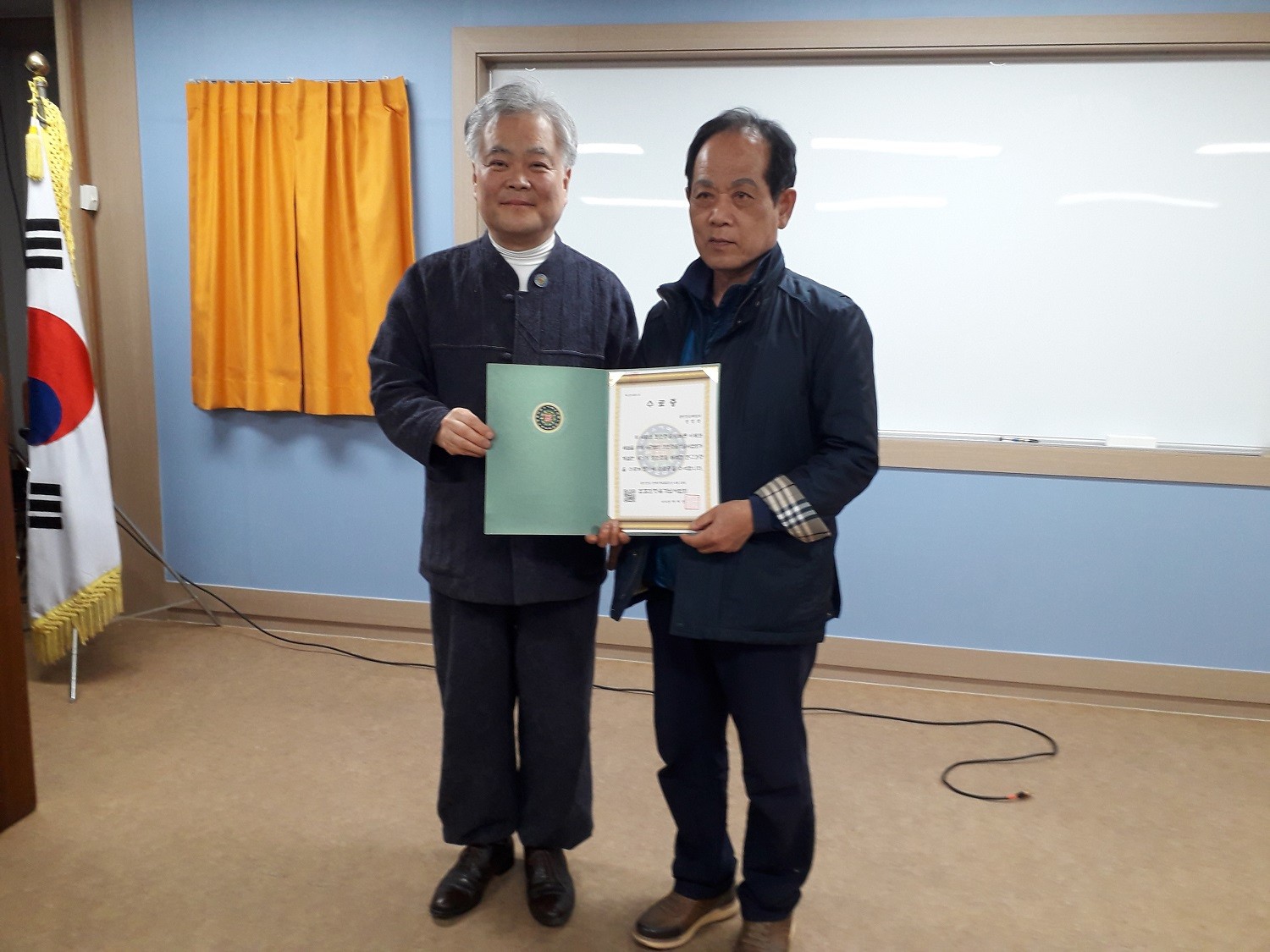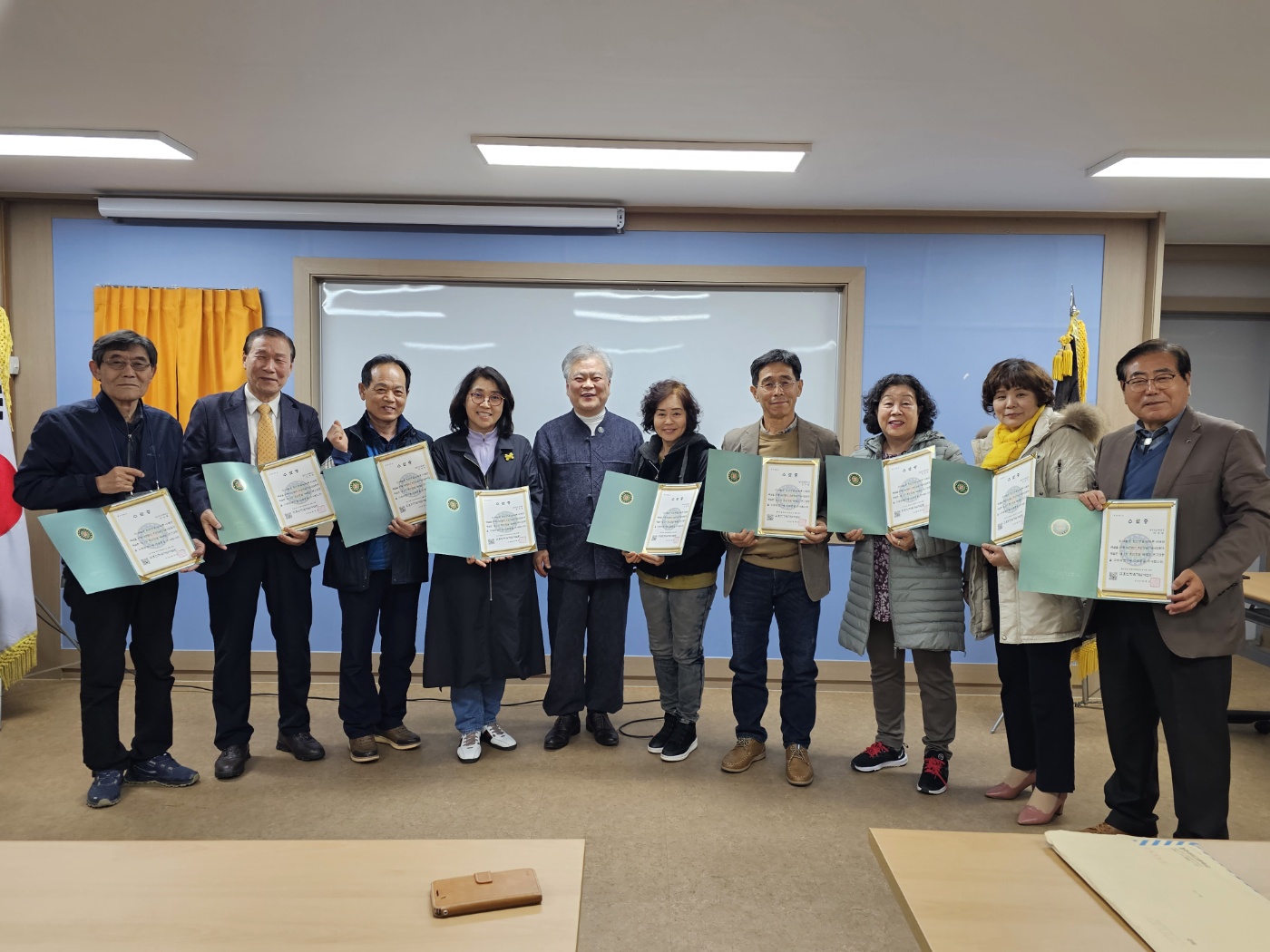 제1기 훈민정음 해례본 연구과정 수료생들 좌로부터 이명희, 김전원, 전영찬, 홍영표, 박재성 이사장, 조민주, 김건일, 정은오, 김동인, 이종대, 이동주 훈민정음해설사