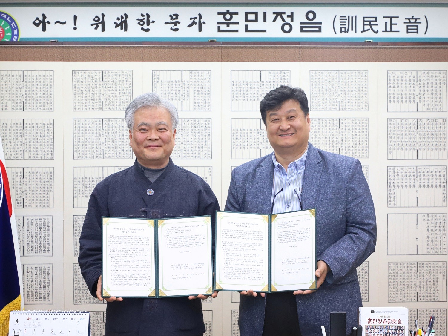 2023년 4월 17일(월) 오후 3시 사단법인 훈민정음기념사업회 회의실에서 박재성 이사장과 한국전적박물관 최형석 관장은 한국전적박물관이 소장하고 있는 국보급 언문 관련 전적에 대한 훈민정음탑 건립 시 전시와 기증에 관한 업무협약식을 거행하였다.