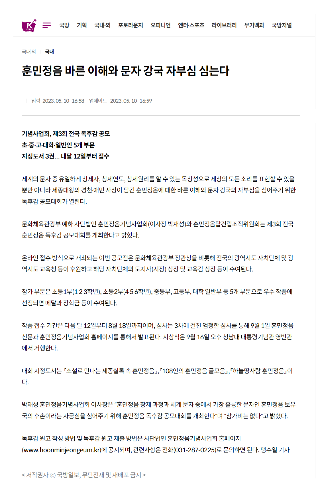 [국방일보] (인터넷판)훈민정음 바른 이해와 문자 강국 자부심 심는다.