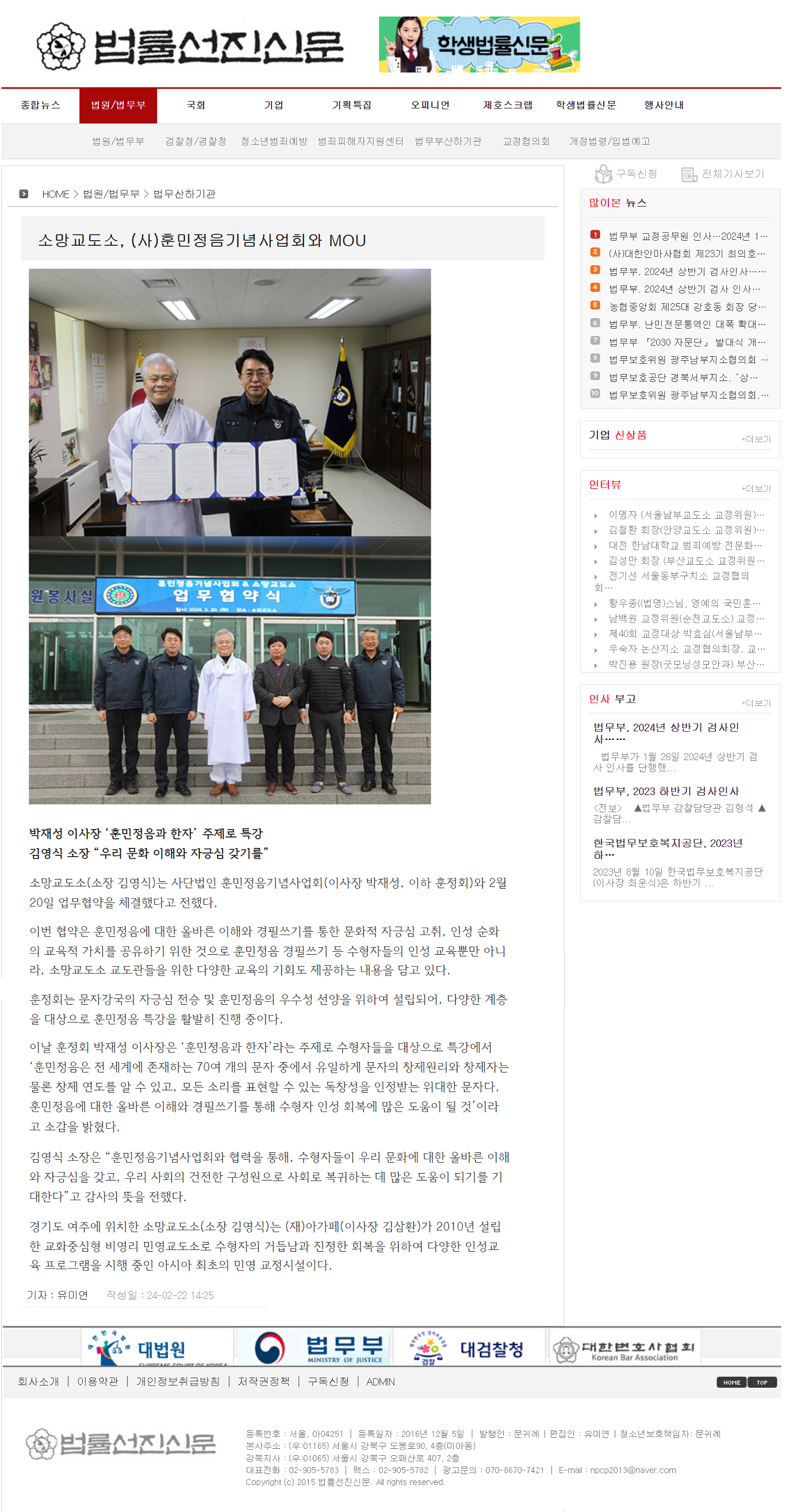 [법률선진신문] 소망교도소, (사)훈민정음기념사업회와 MOU