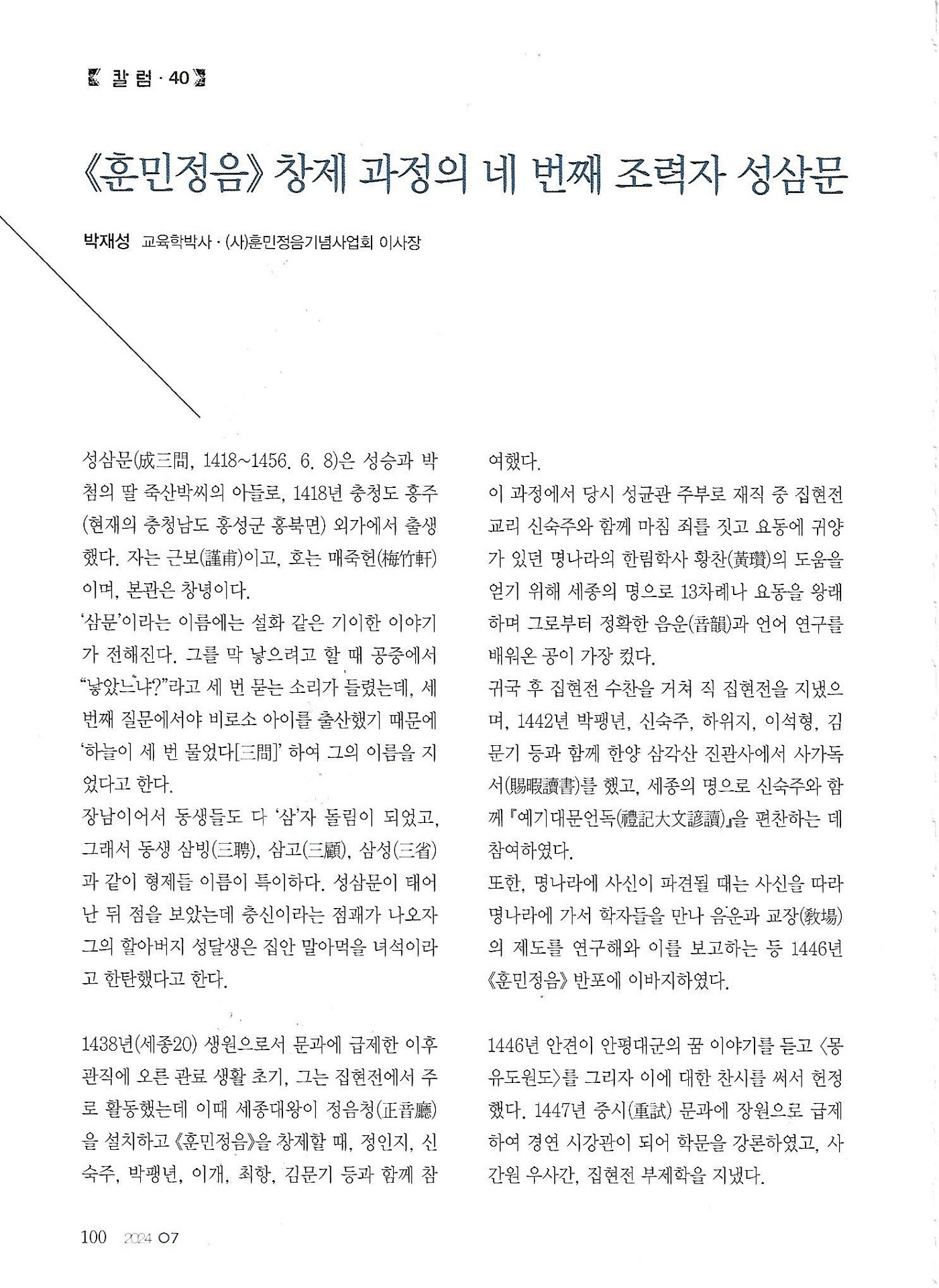 [칼럼 40] 훈민정음 창제 과정의 네 번째 조력자 성삼문