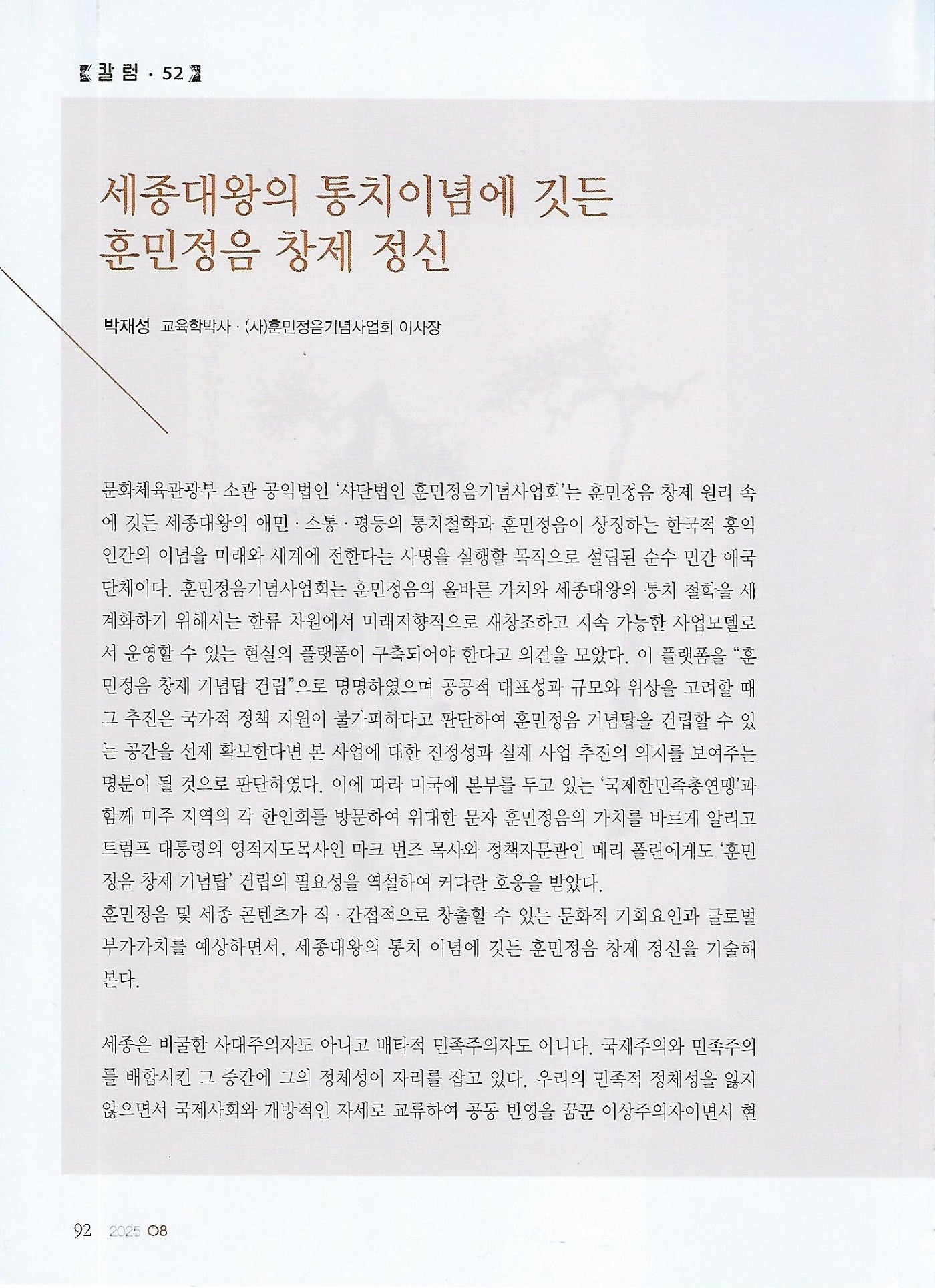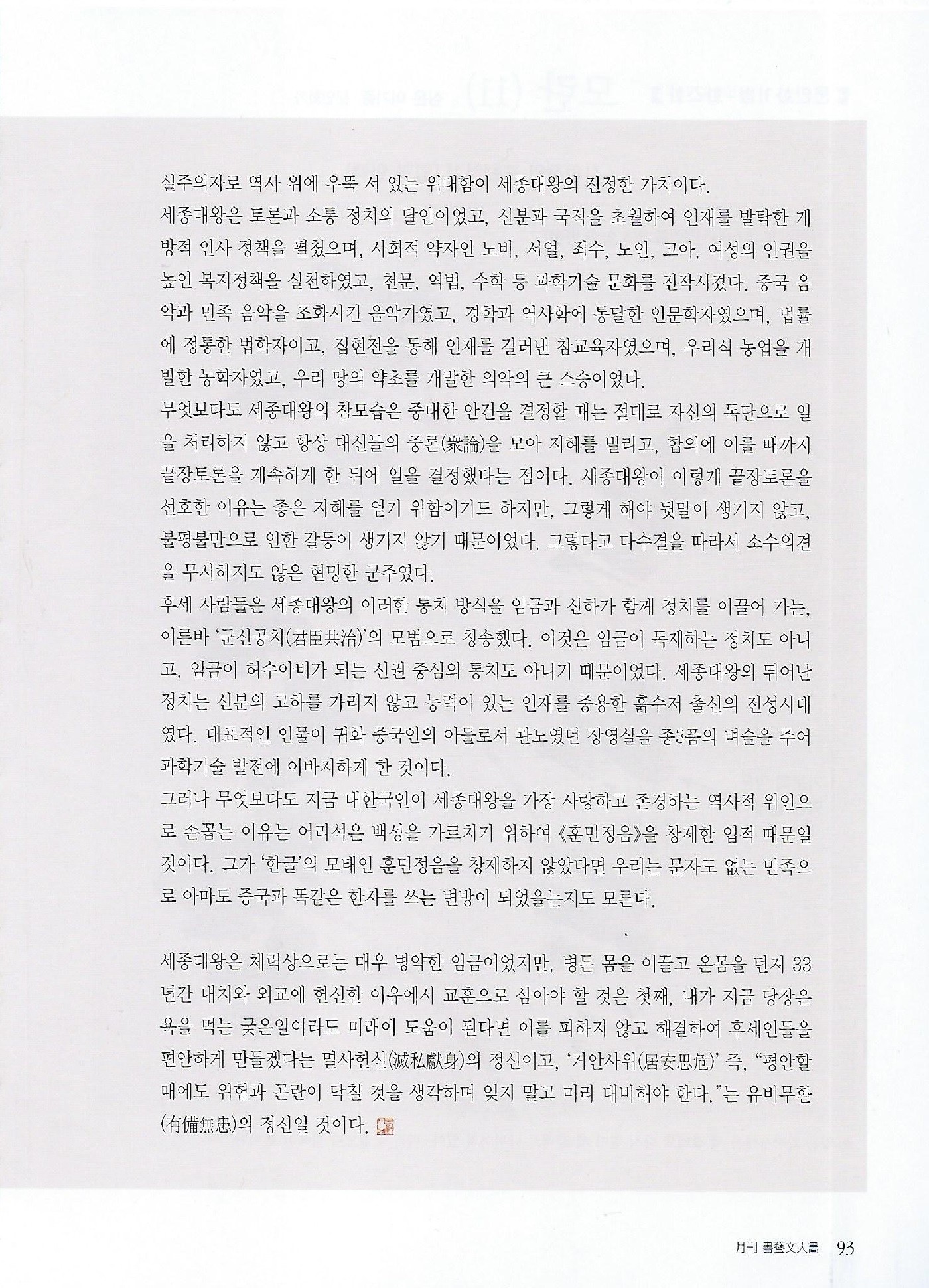 [칼럼 52] 세종대왕의 통치이념에 깃든 훈민정음 창제 정신