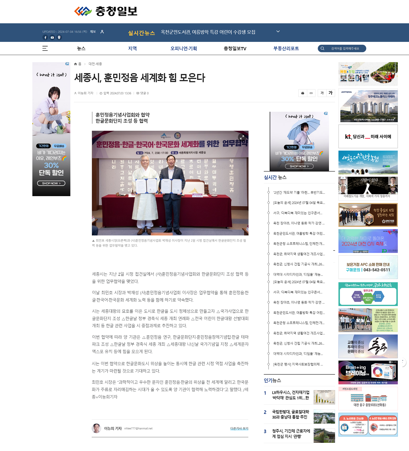 [충청일보] 세종시, 훈민정음 세계화 힘 모은다