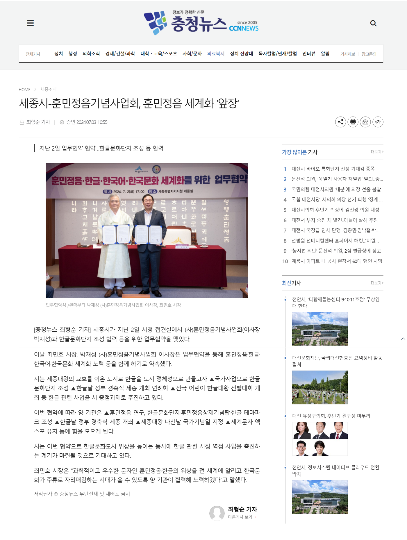 [충청일보] 세종시, 훈민정음 세계화 힘 모은다