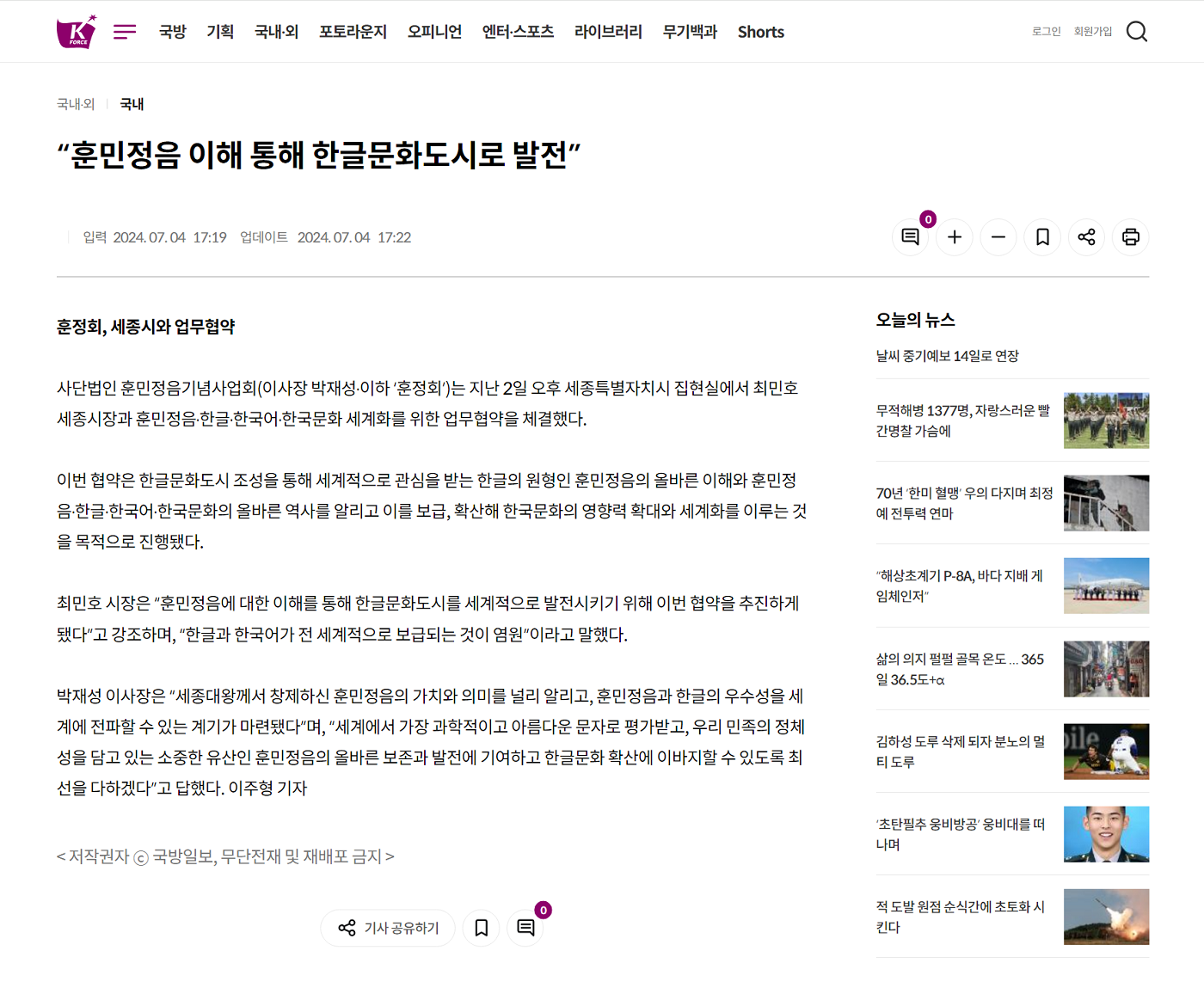 [국방일보](인터넷판) 훈민정음 이해 통해 한글문화도시로 발전