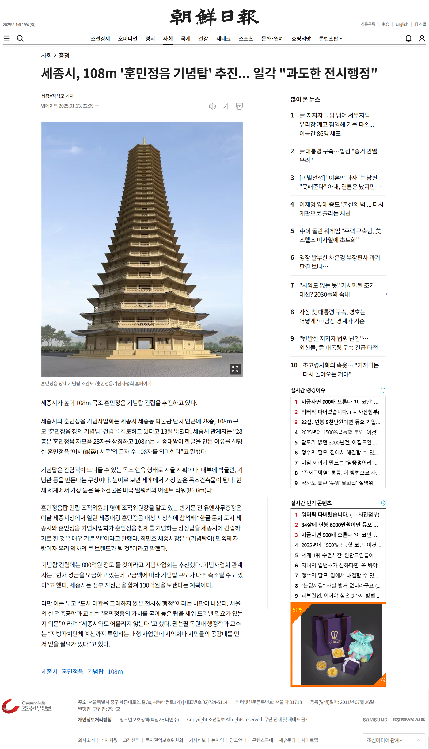 [조선일보] 세종시, 108m '훈민정음 기념탑' 추진...