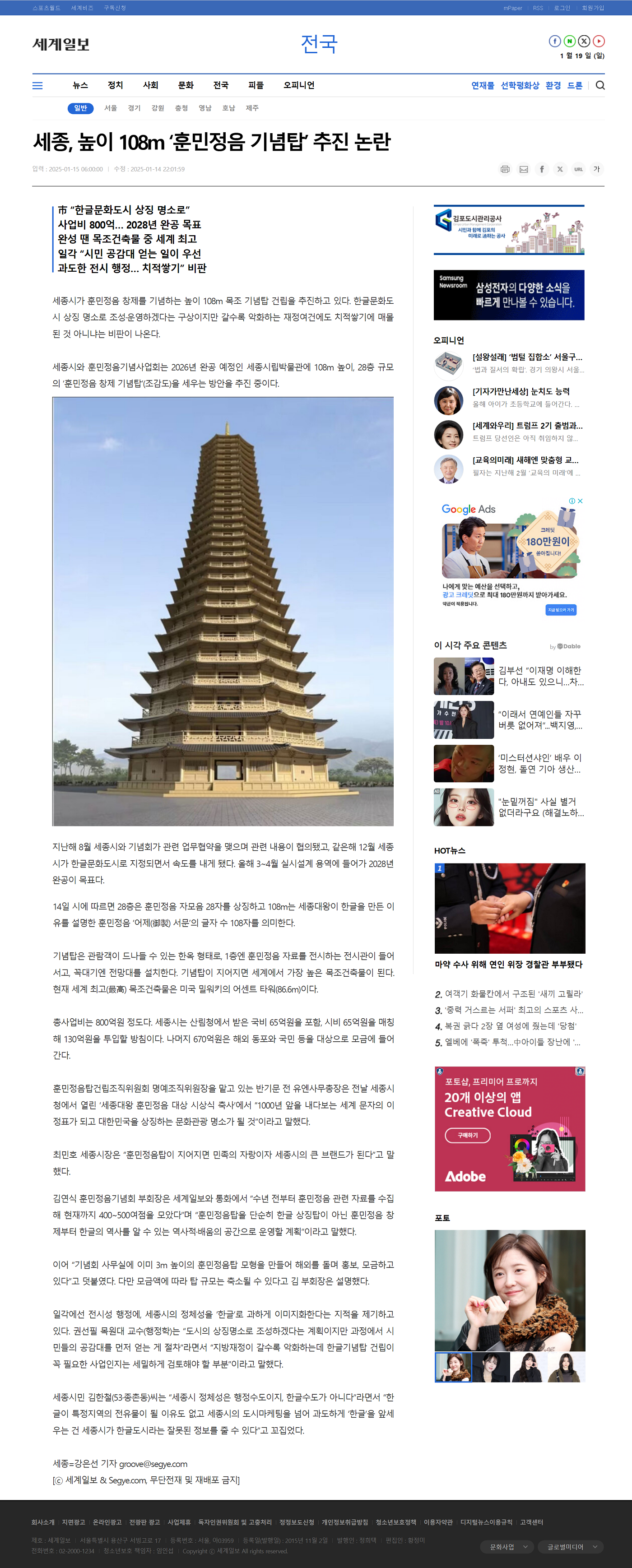 [세계일보] 세종, 높이 108m '훈민정음 기념탑' 추진 논란