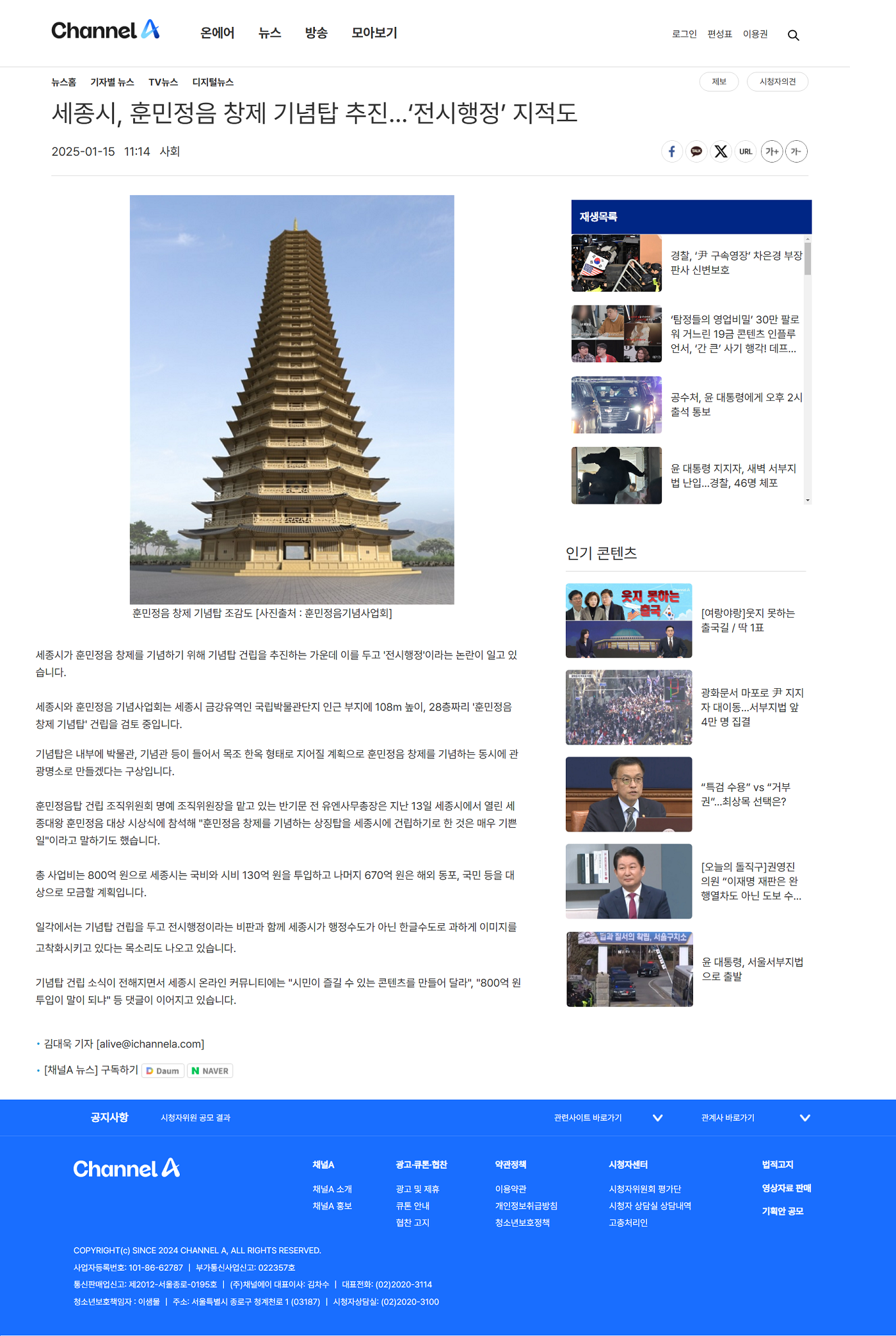 [세계일보] 세종, 높이 108m '훈민정음 기념탑' 추진 논란