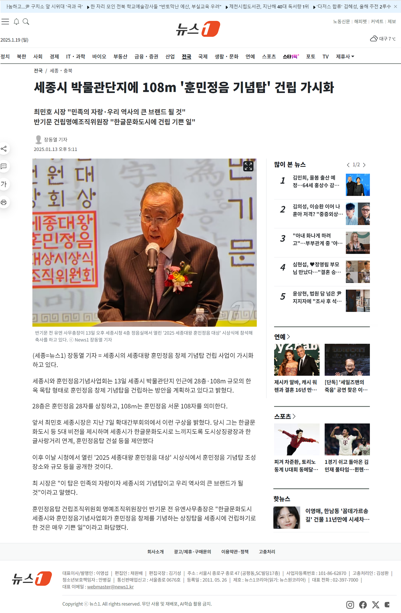 [뉴스1] 세종시 박물관단지에 108m '훈민정음 기념탑' 건립 가시화