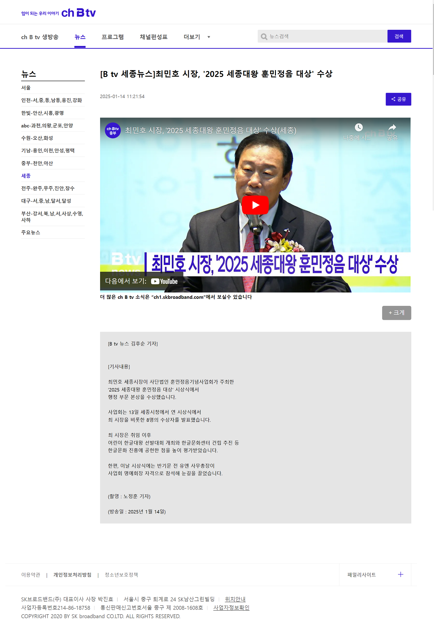 [B tv 세종뉴스] 최민호 시장, '2025 세종대왕 훈민정음 대상' 수상
