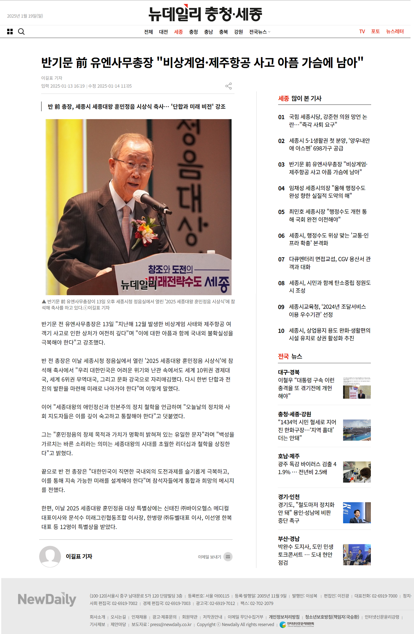[뉴데일리 충청세종] 반 前 총장, 세종대왕 훈민정음 시상식 축사
