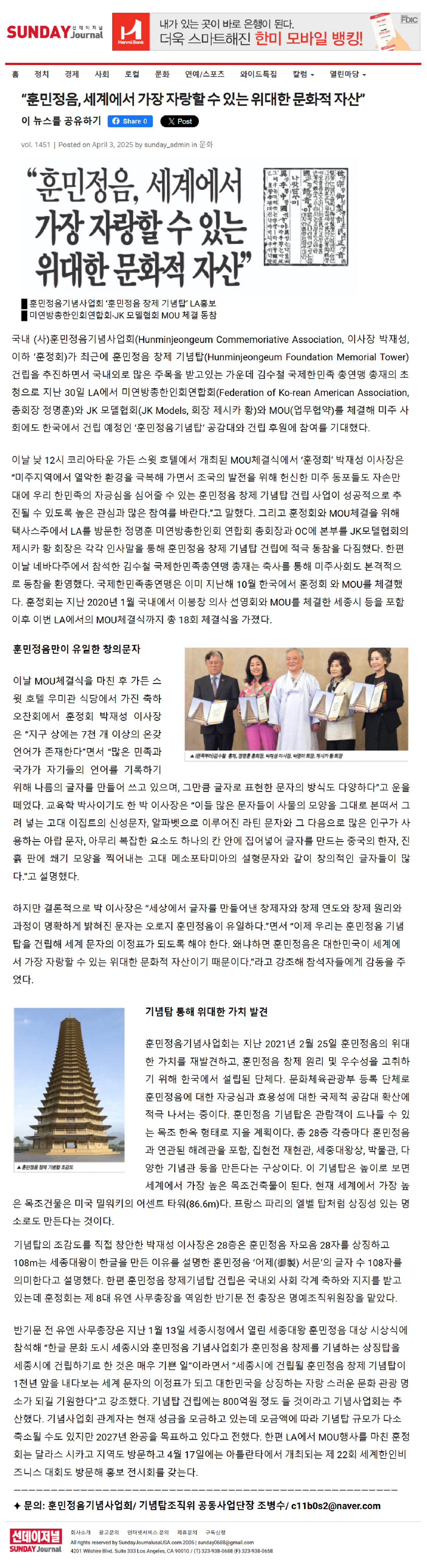 [SUNDAY Journal] 훈민정음기념사업회 '훈민정음 창제 기념탑' LA홍보