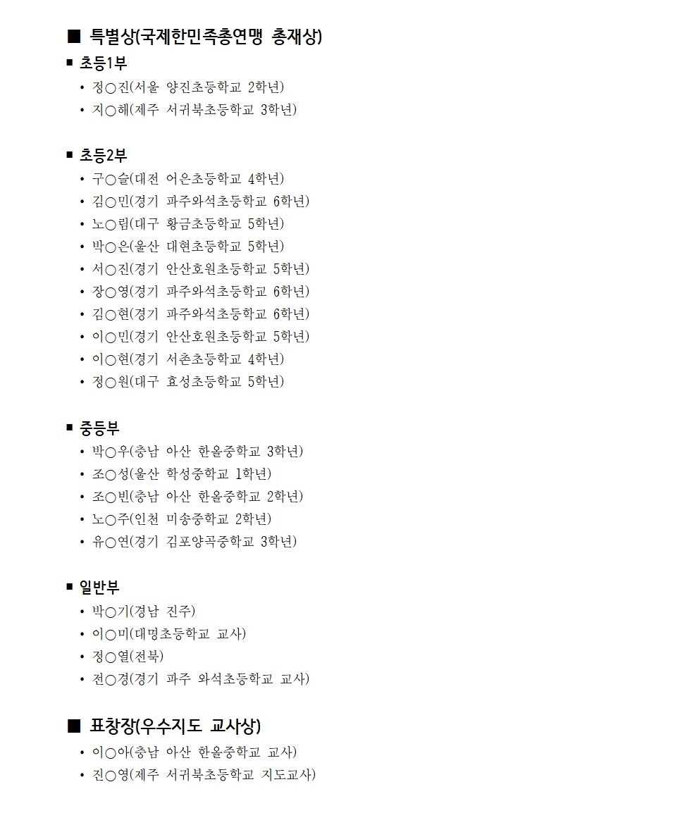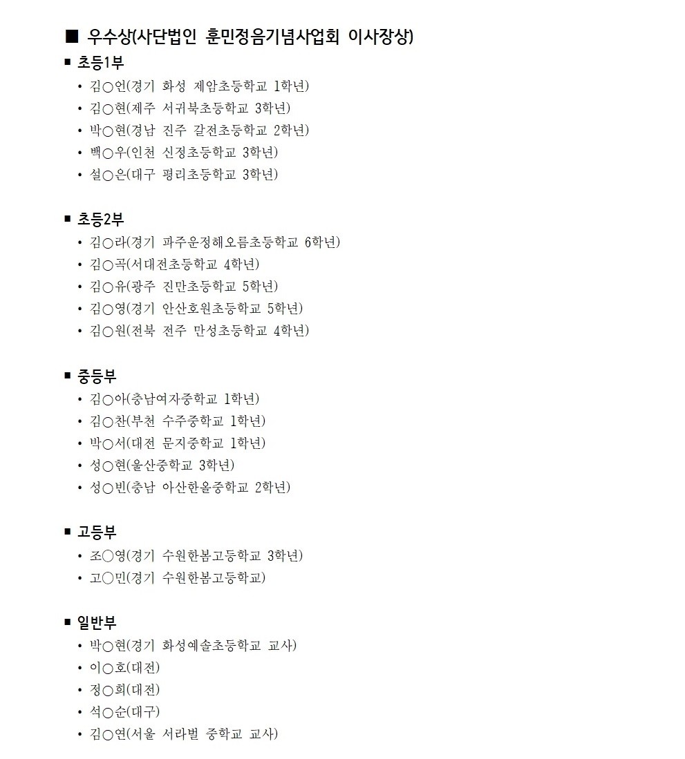 제5회 전국 훈민정음 독후감 공모대회 수상자 여러분 축하드립니다.