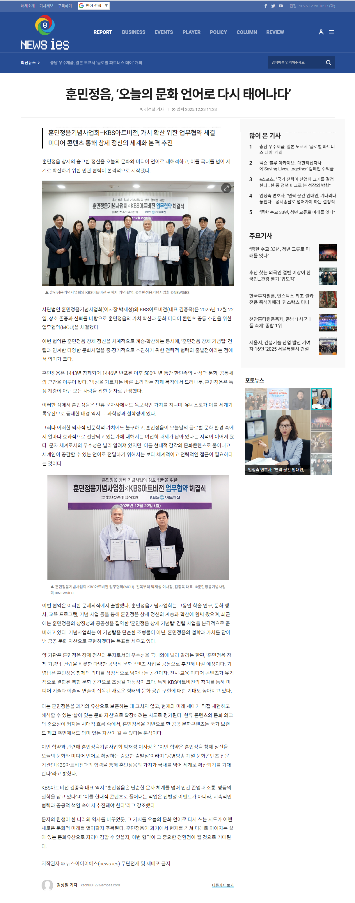 [아태경제저널] 훈민정음기념사업회-KBS아트비전, 문화.미디어 콘텐츠 공동 추진