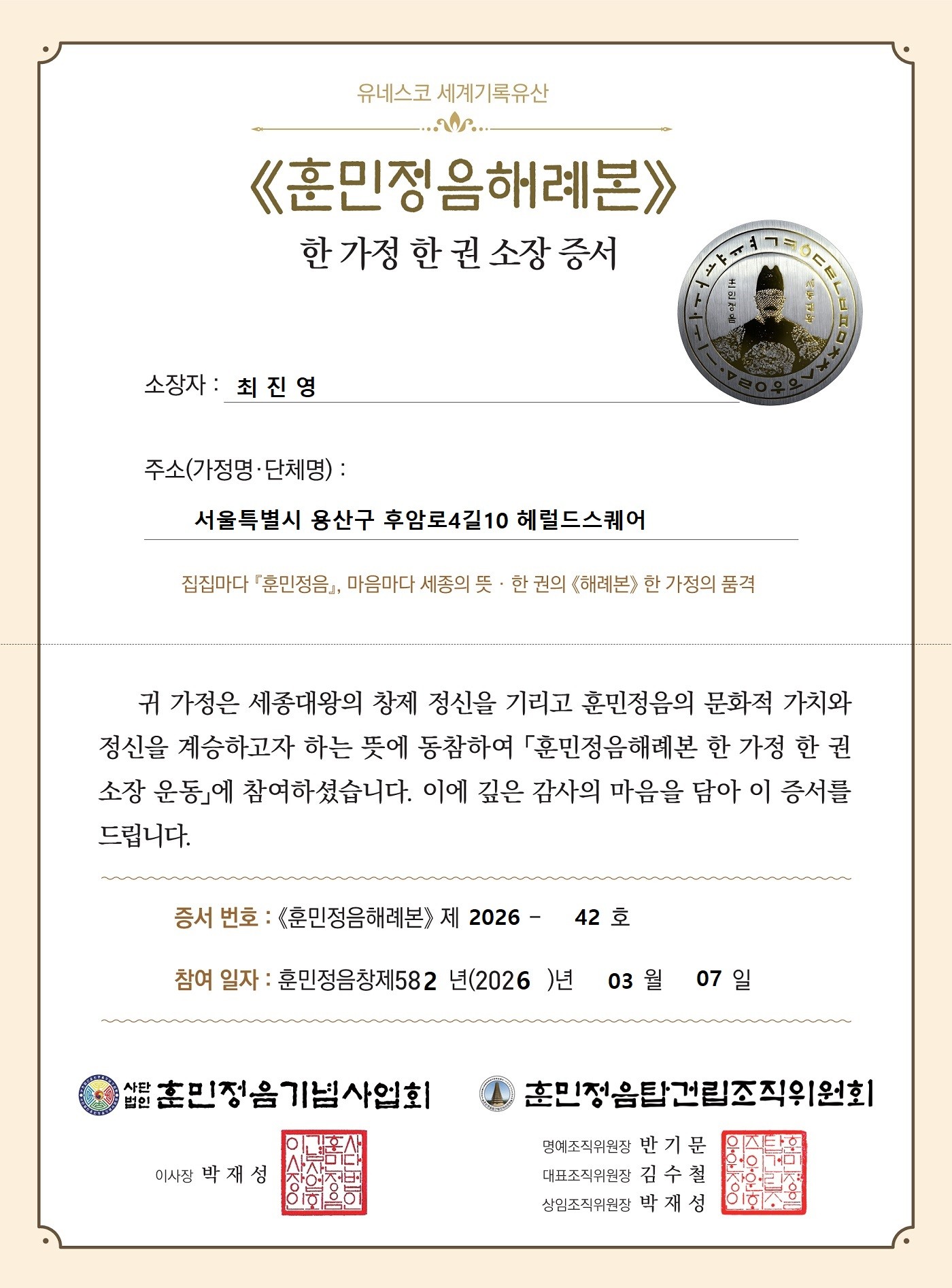 《해례본》 42호 소장자 최진영 헤럴드미디어그룹 대표이사 가족
