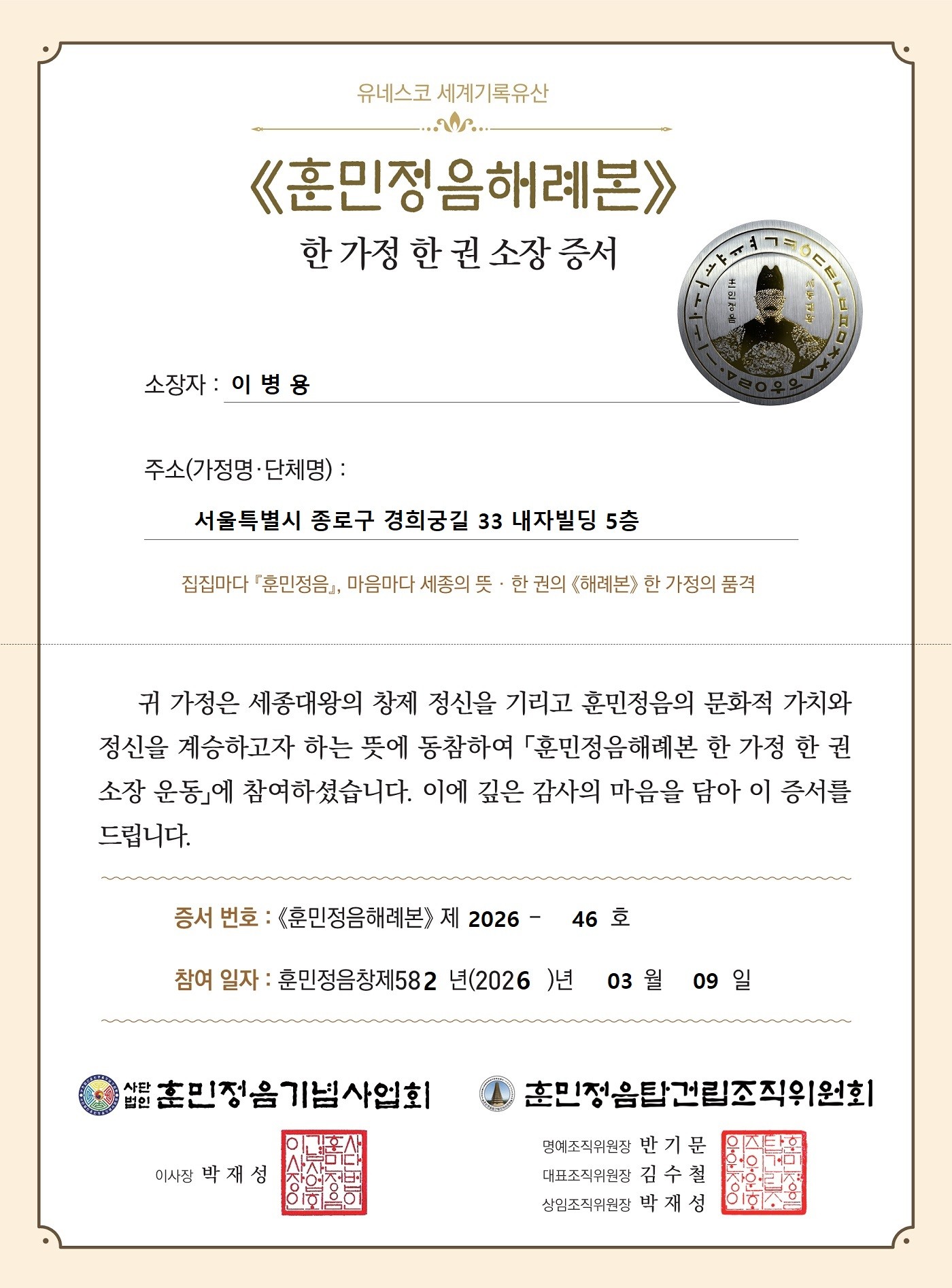 《해례본》 46호 소장자 이병용 가족