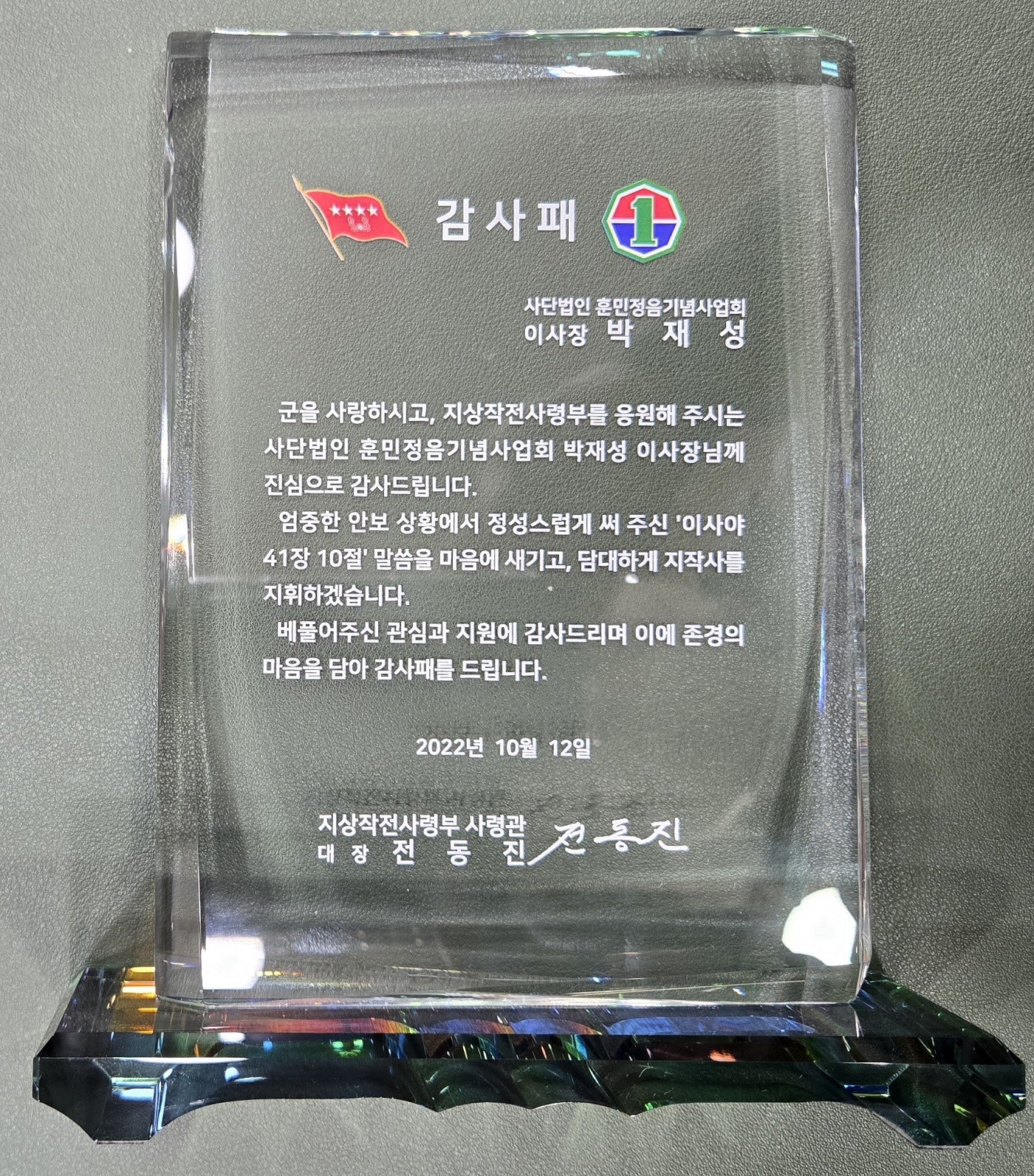 2022년 10월 12일, 지상작전사령부 사령관 전동진 대장은 훈민정음의 가치 확산과 군 정신전력 증진에 기여한 공로를 인정하여 사단법인 훈민정음기념사업회 박재성 이사장에게 감사패를 수여하고, 지상작전사령관 상징 코인과 감사 편지를 전달하였습니다.