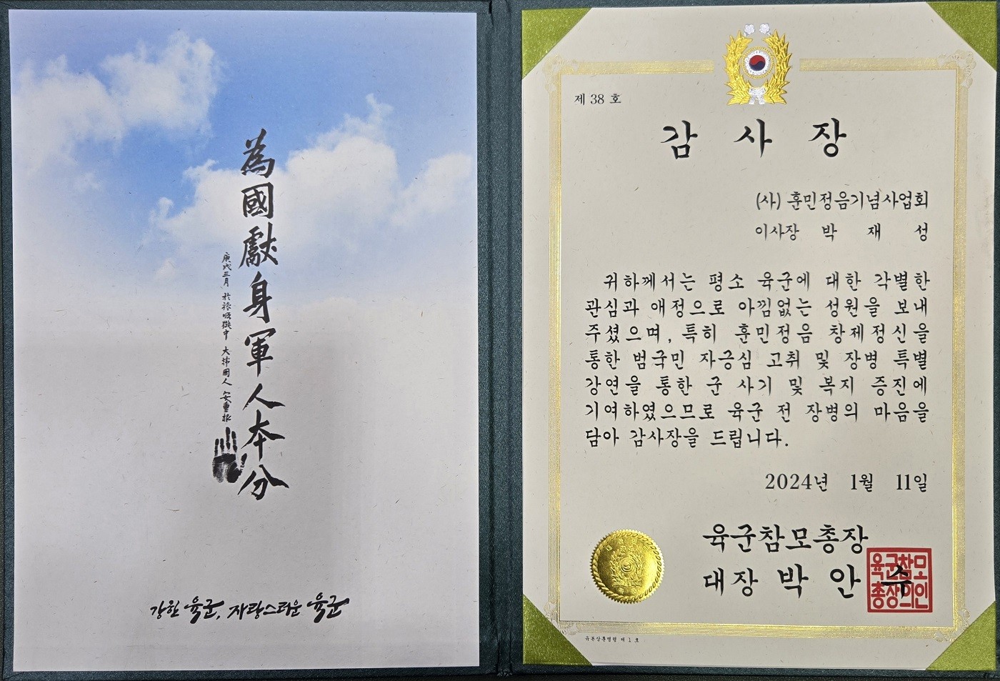 2024년 1월 11일, 사단법인 훈민정음기념사업회 박재성 이사장은 육군 발전 및 정신전력 증진에 기여한 공로를 인정받아 제51대 육군참모총장 박안수 대장의 감사장과 육군참모총장 상징 코인을 수여받았습니다.